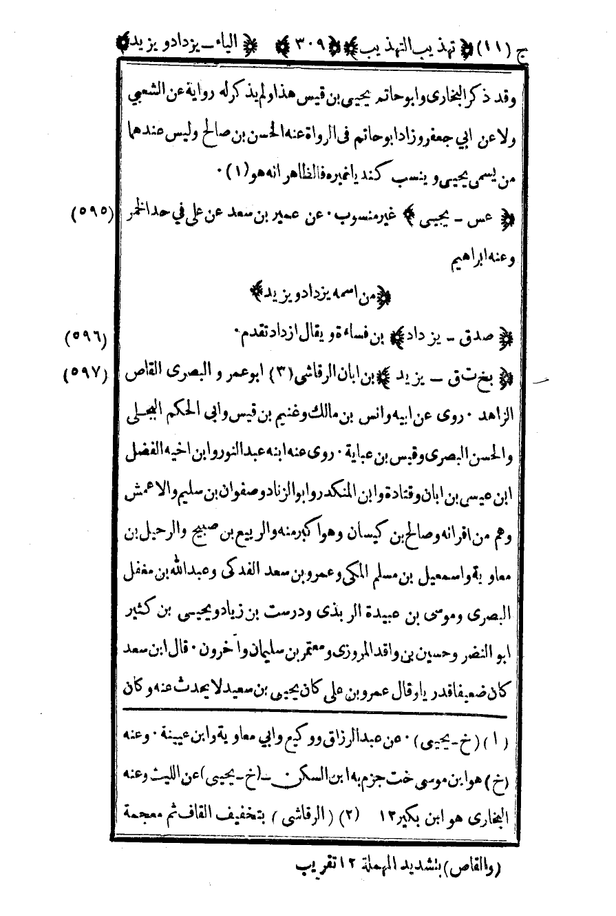 1 "خ – يحيى" عن عبد الرزاق ووكيع وأبي معاوية وابن عيينة وعنه "خ" هو ابن موسى خت جزم به ابن السكن "خ – يحيى" عن الليث وعنه البخاري هو ابن بكير 12.