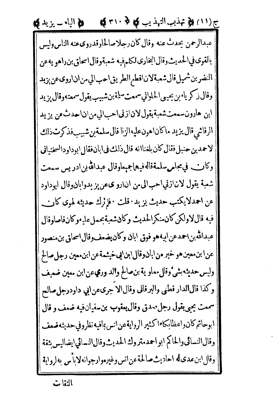 عبد الرحمن يحدث عنه وقال كان رجلا صالحا وقد روى عنه الناس وليس بالقوي في الحديث وقال البخاري: تكلم فيه شعبة وقال إسحاق بن راهويه عن النضر بن شميل قال شعبة لأن أقطع الطريق أحب إلى من أن أروى عن يزيد وقال زكريا بن يحيى الحلواني سمعت سلمة بن شبيب يقول سمعته وقال يزيد بن هارون سمعت شعبة يقول لأن ازني أحب إلى من أن أحدث عن يزيد الرقاشي قال يزيد ما كان أهون عليه الزنا قال سلمة بن شبيب فذكرت ذلك لأحمد بن حنبل فقال كان بلغنا أنه قال ذلك في أبان فقال أبو داود السختياني وكان في مجلس سلمة قاله فيهما جميعا وقال عبد الله بن إدريس سمعت شعبة يقول لأن ازني أحب إلي من أن أروي عن يزيد وأبان وقال أبو داود عن أحمد لا يكتب حديث يزيد قلت: فلم ترك حديثه لهوى كان فيه قال لا ولكن كان منكر الحديث وكان شعبة يحمل عليه وكان قاصا وقال عبد الله بن أحمد عن أبيه هو فوق أبان وكان يضعف وقال إسحاق بن منصور عن بن معين هو خير من أبان وقال بن أبي خيثمة عن بن معين رجل صالح وليس حديثه بشيء وقال معاوية بن صالح والدوري عن بن معين ضعيف وكذا قال الدارقطني: والبرقاني وقال الآجري عن أبي داود رجل صالح سمعت يحيى يقول رجل صدق وقال يعقوب بن سفيان فيه ضعف وقال أبو حاتم: كان واعظا بكاء كثير الرواية عن أنس بما فيه نظر وفي حديثه ضعف وقال النسائي: والحاكم أبو أحمد متروك الحديث وقال النسائي: أيضا ليس بثقة وقال بن عدي له أحاديث صالحة عن أنس وغيره وأرجو أنه لا بأس به لرواية