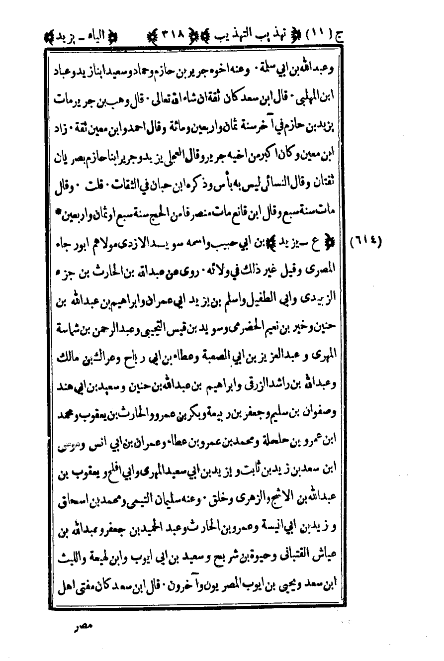 614-"ع – يزيد" بن أبي حبيب واسمه سويد الأزدي مولاهم أبو رجاء المصري وقيل غير ذلك في ولائه روى عن عبد الله بن الحارث بن جزء الزبيدي وأبي الطفيل وأسلم بن يزيد أبي عمران وإبراهيم بن عبد الله بن حنين وخير بن نعيم الحضرمي وسويد بن قيس التجيبي وعبد الرحمن بن شماسة المهري وعبد العزيز بن أبي الصعبة وعطاء بن أبي رباح وعراك بن مالك وعبد الله بن راشد الزرقي وإبراهيم بن عبد الله بن حنين وسعيد بن أبي هند وصفوان بن سليم وجعفر بن ربيعة وبكر بن عمرو والحارث بن يعقوب ومحمد بن عمرو بن حلحلة ومحمد بن عمرو بن عطاء وعمران بن أبي أنس وموسى بن سعد بن زيد بن ثابت ويزيد بن أبي سعيد المهري وأبي أفلح ويعقوب بن عبد الله بن الأشج والزهري وخلق وعنه سليمان التيمي ومحمد بن إسحاق وزيد بن أبي أنيسة وعمرو بن الحارث وعبد الحميد بن جعفر وعبد الله بن عياش القتباني وحيوة بن شريح وسعيد بن أبي أيوب وابن لهيعة والليث بن سعد ويحيى بن أيوب المصريون وآخرون قال بن سعد كان مفتي أهل
