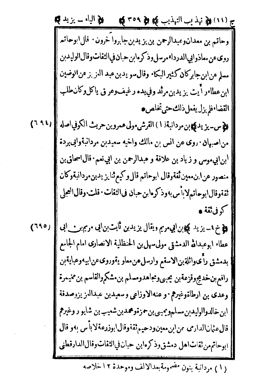 694-"س – يزيد" بن مردانبة1 القرشي مولى عمرو بن حريث الكوفي أصله من أصبهان روى عن أنس بن مالك وأخيه سعيد بن مردانبة وأبي بردة بن أبي موسى وزياد بن علاقة وعبد الرحمن بن أبي نعيم قال إسحاق بن منصور عن بن معين ثقة وقال أبو حاتم: قال وكيع ثنا يزيد بن مردانبة وكان ثقة وقال أبو حاتم: لا بأس وذكره بن حبان في الثقات قلت: وقال العجلي كوفي ثقة.