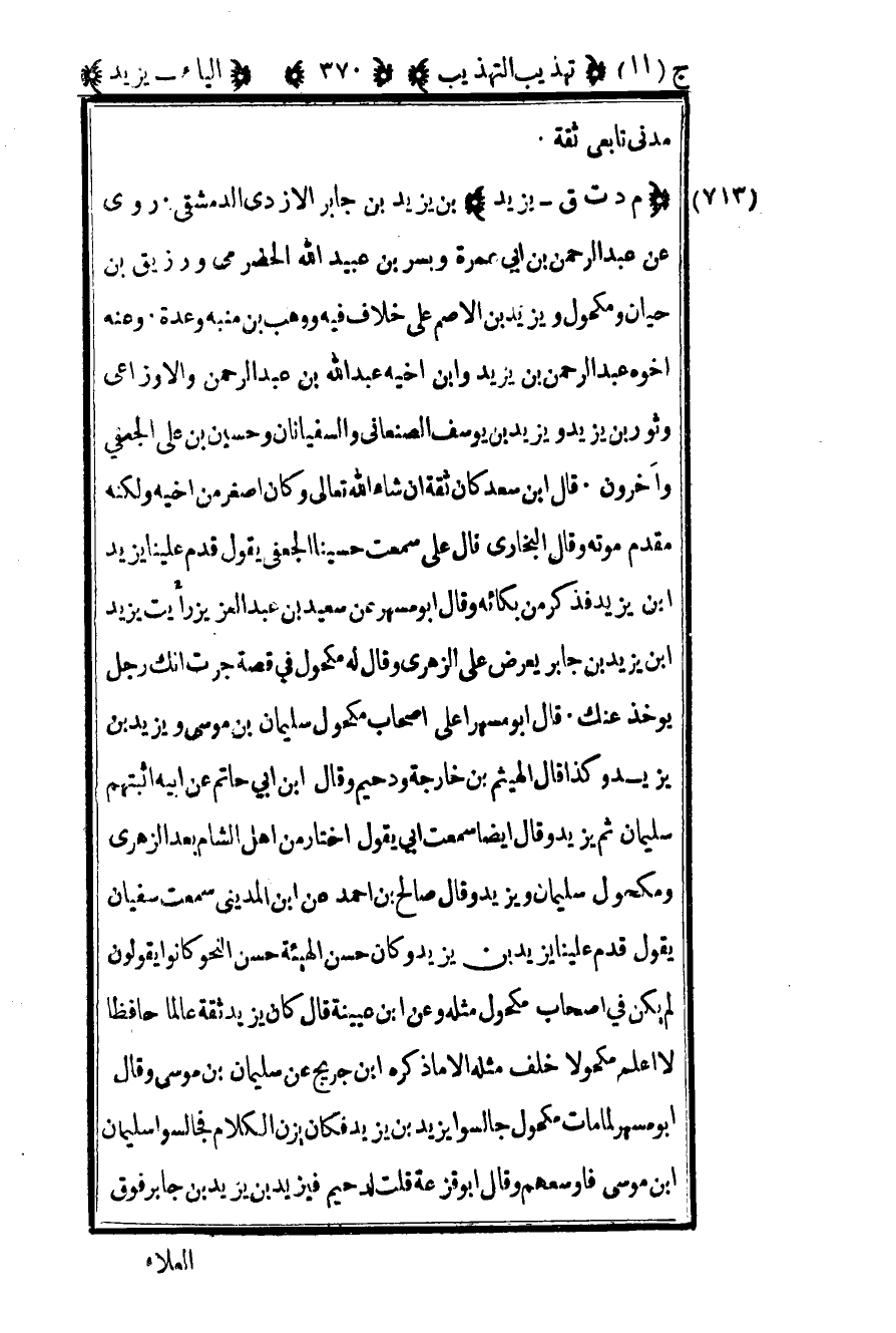 713-"م د ت ق – يزيد" بن يزيد بن جابر الأزدي الدمشقي روى عن عبد الرحمن بن أبي عمرة وبسر بن عبيد الله الحضرمي ورزيق بن حيان ومكحول ويزيد بن الأصم على خلاف فيه ووهب بن منية وعدة وعنه أخوه عبد الرحمن بن يزيد وابن أخيه عبد الرحمن والأوزاعي وثور بن يزيد ويزيد بن يوسف الصنعاني والسفيانان وحسين بن علي الجعفي وآخرون قال بن سعد كان ثقة أن الله تعالى وكان أصغر من أخيه ولكنه مقدم موته وقال البخاري: قال علي سمعت حسينا الجعفي يقول قدم علينا يزيد بن يزيد فذكر من بكائه وقال أبو مسهر عن سعيد بن عبد العزيز رأيت يزيد بن يزيد بن جابر يعرض على الزهري وقال له مكحول في قصة جرت انك رجل يؤخذ عنك قال أبو مسهر أعلى أصحاب مكحول سليمان بن موسى ويزيد بن يزيد وكذا قال الهيثم بن خارجة ودحيم وقال بن أبي حاتم عن أبيه أثبتهم سليمان ثم يزيد وقال أيضا سمعت أبي يقول أختار من أهل الشام بعد الزهري ومكحول سليمان ويزيد وقال صالح بن أحمد عن بن المديني سمعت سفيان يقول قدم علينا يزيد بن يزيد وكان حسن الهيئة حسن النحو كانوا يقولون لم يكن في أصحاب مكحول مثله وعن بن عيينة قال كان يزيد ثقة عالما حافظا لا أعلم مكحولا خلف مثله إلا ما ذكره بن جريج عن سليمان بن موسى وقال أبو مسهر لما مات مكحول جالسوا يزيد بن يزيد فكان يزن الكلام فجالسوا سليمان بن موسى فأوسعهم وقال أبو قزعة قلت: لدحيم فيزيد بن يزيد بن جابر فوق
