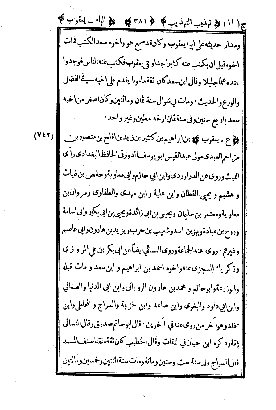 742-"ع – يعقوب" بن إبراهيم بن كثير بن زيد بن أفلح بن منصور بن مزاحم العبدي مولى عبد القيس أبو يوسف الدورقي الحافظ البغدادي رأى الليث وروى عن الدراوردي وابن أبي حازم وأبي معاوية وحفص بن غياث وهشيم ويحيى القطان وابن علية وابن مهدي والطفاوي ومروان بن معاوية ومعتمر بن سليمان ويحيى بن أبي زائدة ويحيى بن أبي بكير وأبي أسامة وروح بن عبادة وبهز بن أسد وشعيب بن حرب ويزيد بن هارون وأبي عاصم وغيرهم روى عنه الجماعة وروى النسائي أيضا عن أبي بكر بن علي المروزي وزكرياء السجزي عنه وأخوه أحمد بن إبراهيم وابن سعد ومات قبله وأبو زرعة وأبو حاتم ومحمد بن هارون الروياني وابن أبي الدنيا والصغاني وابن أبي داود البغوي وابن صاعد وابن خزيمة والسراج والمحاملي وابن مخلد وهو آخر من روى عنه في آخرين قال أبو حاتم: صدوق وقال النسائي: ثقة وذكره بن حبان في الثقات وقال الخطيب كان ثقة متقنا صنف المسند قال السراج ولد سنة ستين وستين ومائة ومات سنة اثنتين وخمسين ومائتين وفيها أرخه غير واحد قلت: وقال مسلمة كان كثير الحديث ثقة.