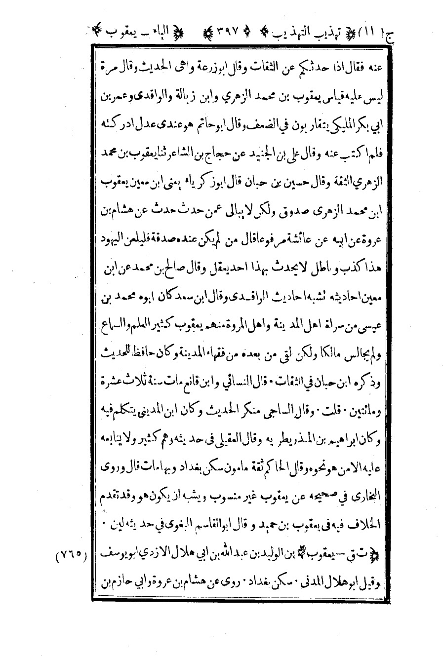 765-"ت ق – يعقوب" بن الوليد بن عبد الله بن أبي هلال الأزدي أبو يوسف وقيل أبو هلال المدني سكن بغداد روى عن هشام بن عروة وأبي حازم بن