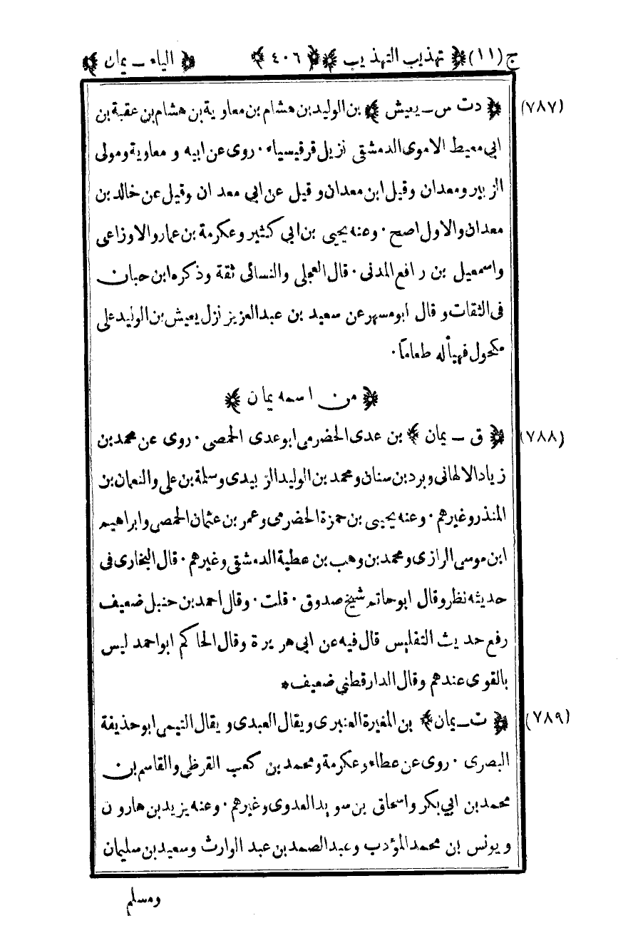787-"د ت س – يعيش" بن الوليد بن هشام بن معاوية بن هشام بن عقبة بن أبي معيط الأموي الدمشقي نزيل قرقيسياء روى عن أبيه ومعاوية ومولى الزبير ومعدان وقيل بن معدان وقيل عن أبي معدان وقيل عن خالد بن معدان والأول أصح وعنه يحيى بن أبي كثير وعكرمة بن عمار والأوزاعي وإسماعيل بن رافع المدني قال العجلي والنسائي ثقة وذكره بن حبان في الثقات وقال أبو مسهر عن سعيد بن عبد العزيز نزل يعيش بن الوليد على مكحول فهيأ له طعاما.