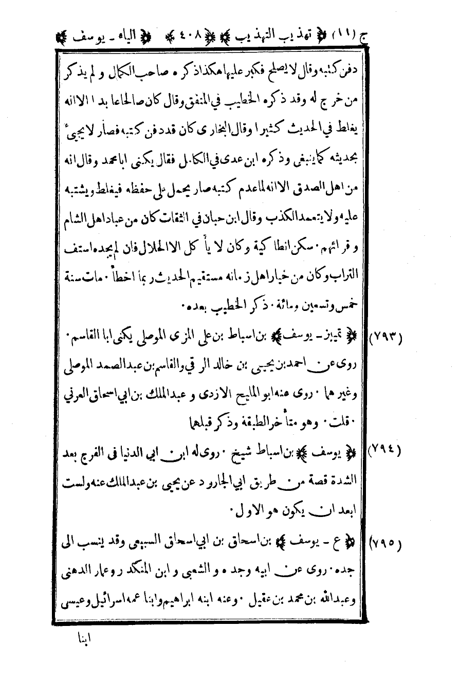 793-"تمييز يوسف" بن أسباط بن علي المزي الموصلي يكنى أبا القاسم روى عن أحمد بن يحيى بن خالد الرقي والقاسم بن عبد الصمد الموصلي وغيرهما روى عنه أبو المليح الأزدي وعبد الملك بن أبي إسحاق العرني قلت: وهو متأخر الطبقة وذكر قبلهما.