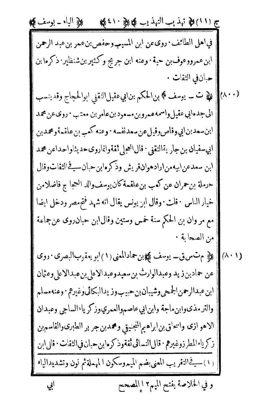 800-"ت – يوسف" بن الحكم بن أبي عقيل الثقفي أبو الحجاج وقد ينسب إلى جده أبي عقيل واسمه عمرو بن مسعود بن عامر بن معتب روى عن محمد بن سعد بن أبي وقاص وقيل عن سعد نفسه وعنه كعب بن علقمة ومحمد بن أبي سفيان بن جارية الثقفي قال العجلي ثقة وإنما روى حديثا واحدا عن محمد بن سعد عن أبيه من أراد هوان قريش وذكره بن حبان في الثقات وقال حرملة بن حمران عن كعب بن علقمة كان يوسف والد الحجاج فاضلا بن خيار قلت: وقال بن يونس يقال أنه شهد فتح مصر ودخل أيضا مع مروان بن الحكم سنة خمس وستين وقال بن حبان روى عن جماعة من الصحابة.