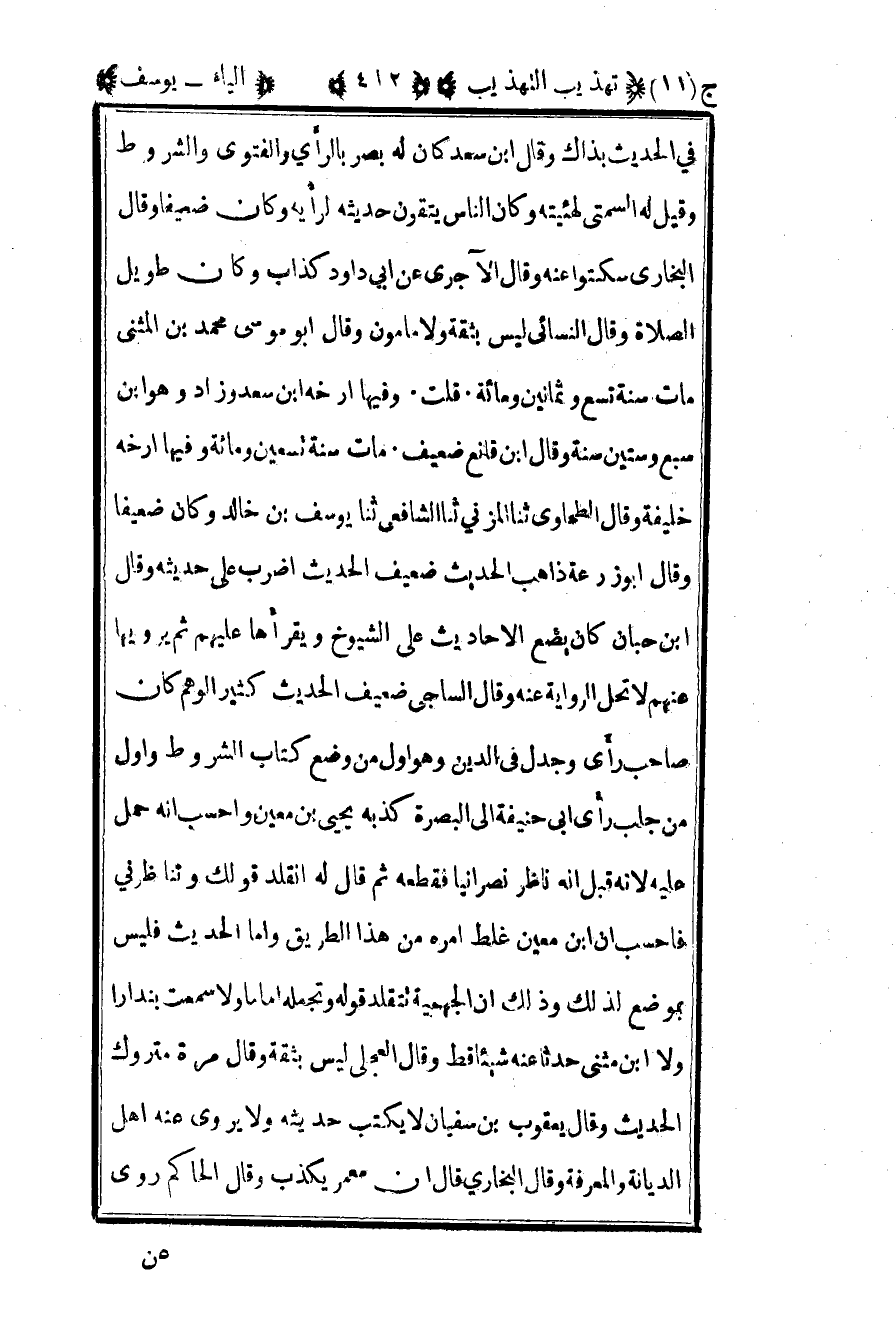 في الحديث بذاك وقال بن سعد كان له بصر بالرأي والفتوى والشروط وقيل له السمتي لهيئته وكان الناس يتقون حديثه لرأيه وكان ضعيفا وقال البخاري: سكتوا عنه وقال الآجري عن أبي داود كذاب وكان طويل الصلاة وقال النسائي: ليس بثقة ولا مأمون وقال أبو موسى محمد بن المثنى مات سنة تسع وثمانين ومائة قلت: وفيها أرخه بن سعد وزاد وهو بن سبع وستين سنة وقال بن قانع ضعيف مات سنة تسعين ومائة وفيها أرخه خليفة وقال الطحاوي ثنا المزني ثنا الشافعي ثنا يوسف بن خالد وكان ضعيفا وقال أبو زرعة ذاهب الحديث ضعيف الحديث اضرب على حديثه وقال بن حبان كان يضع الأحاديث على الشيوخ ويقرأها عليهم ثم يرويها عنهم لا تحل الرواية عنه وقال الساجي ضعيف الحديث كثير الوهم كان صاحب رأي وجدل في الدين وهو أول من وضع كتاب الشروط وأول من جلب رأي أبي حنيفة إلى البصرة كذبه يحيى بن معين وأحسب أنه حمل عليه لأنه قيل أنه ناظر نصرانيا فقطعه ثم قال له انقلد قولك وتناظرني فاحسب أن بن معين غلط أمره من هذا الطريق وأما الحديث فليس بموضع لذلك وذلك أن الجهمية تتقلد قوله وتجعله إماما ولا سمعت بندارا ولا بن مثنى حدثا عنه شيئا قط وقال العجلي: ليس بثقة وقال مرة متروك الحديث وقال يعقوب بن سفيان لا يكتب حديثه ولا يروي عنه أهل الديانة والمعرفة وقال البخاري: قال أن معمر يكذب وقال الحاكم روى