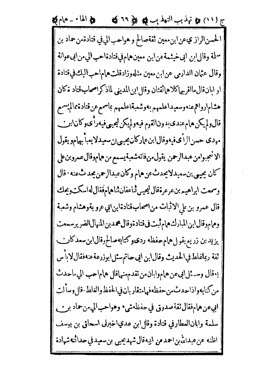 الحسن الرازي عن بن معين ثقة صالح وهو أحب إلي في قتادة من حماد بن سلمة وقال بن أبي خيثمة عن بن معين همام في قتادة أحب إلي من أبي عوانة وقال عثمان الدارمي عن بن معين: مثله وزاد قلت: همام أحب إليك في قتادة أو أبان قال ما أقربهما كلاهما ثقتان وقال بن المديني لما ذكر أصحاب قتادة كان هشام ارواهم عنه وسعيد أعلمهم به وشعبة أعلمهم بما سمع عن قتادة مما لم يسمع قال ولم يكن همام عندي بدون القوم فيه ولم يكن ليحيى فيه رأي وكان بن مهدي حسن الرأي فيه وقال بن عمار كان يحيى بن سعيد لا يعبأ بهمام ويقول ألا تعجبوا من عبد الرحمن يقول من فاته شعبة يسمع من همام وقال عمرو بن علي كان يحيى بن سعيد لا يحدث عن همام وكان عبد الرحمن يحدث عنه قال وسمعت إبراهيم بن عرعرة قال ليحيى ثنا عفان ثنا همام فقال له اسكت ويحك قال عمرو بن علي الاثبات من أصحاب قتادة بن أبي عروبة وهشام وشعبة وهمام وقال بن المبارك همام ثبت في قتادة وقال محمد بن المنهال الضرير سمعت يزيد بن زريع يقول همام حفظه ردئ وكتابه صالح وقال بن سعد كان ثقة ربما غلط في الحديث وقال بن أبي حاتم سئل أبو زرعة عنه فقال لا بأس به قال وسئل أبي عن همام وأبان من تقدم منهما قال همام أحب إلي ما حدث من كتابه وإذا حدث من حفظه فهما متقاربان في الحفظ والغلط قال وسألت أبي عن همام فقال ثقة صدوق في حفظه شيء وهو أحب إلي من حماد بن سلمة وأبان العطار في قتادة وقال بن عدي أخبرني إسحاق بن يوسف أظنه عن عبد الله بن أحمد عن أبيه قال شهد يحيى بن سعيد في حداثته شهادة