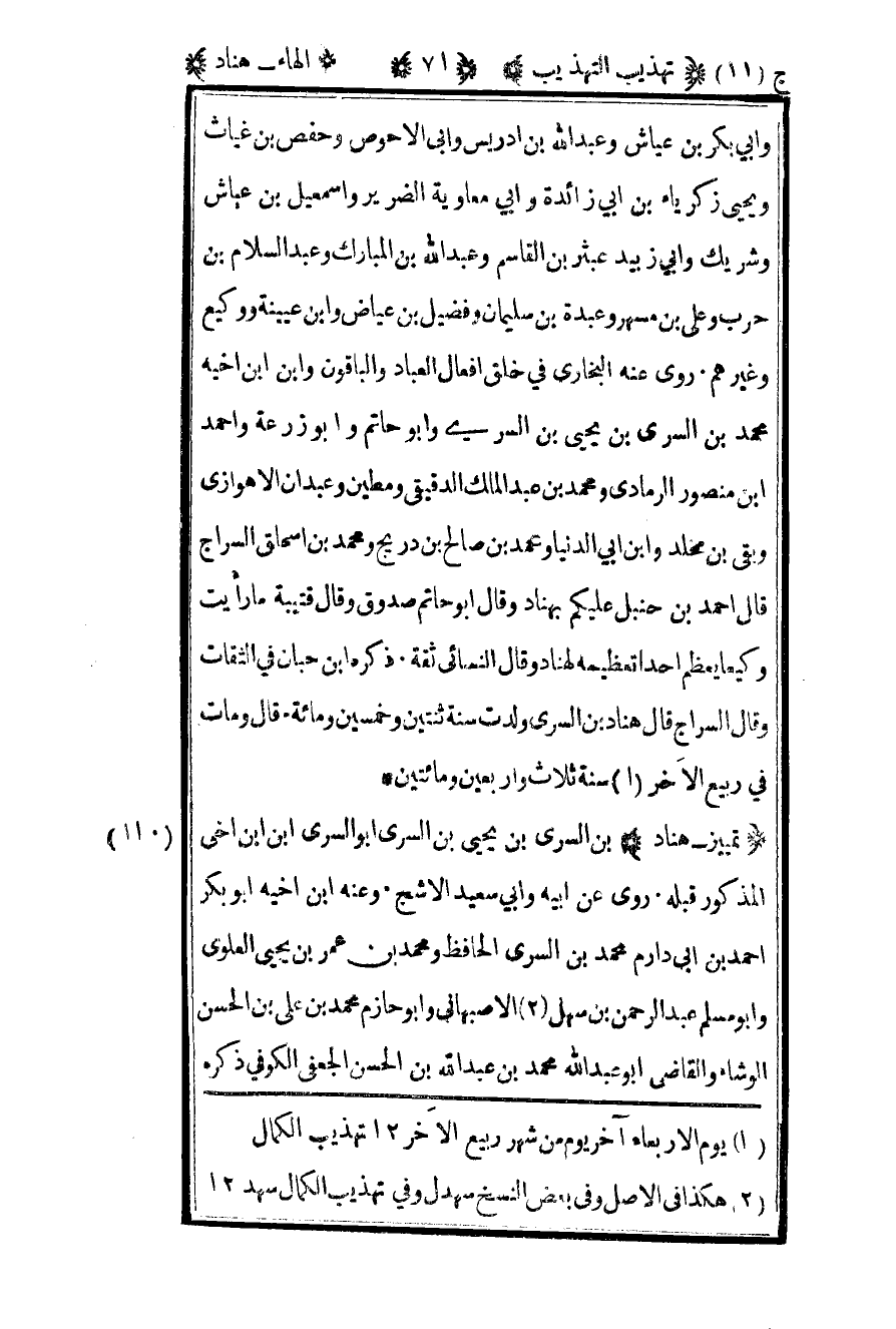 110 – "تمييز - هناد" بن السري بن يحيى بن السري بن بن أخي المذكور قبله روى عن أبيه وأبي سعيد الأشج وعنه بن أخيه أبو بكر أحمد بن أبي دارم محمد بن السري الحافظ ومحمد بن عمر بن يحيى العلوي وأبو مسلم عبد الرحمن بن سهل2 الأصبهاني وأبو حازم محمد بن علي بن الحسن الوشاء والقاضي أبو عبد الله محمد بن عبد الله بن الحسن الجعفي الكوفي ذكره