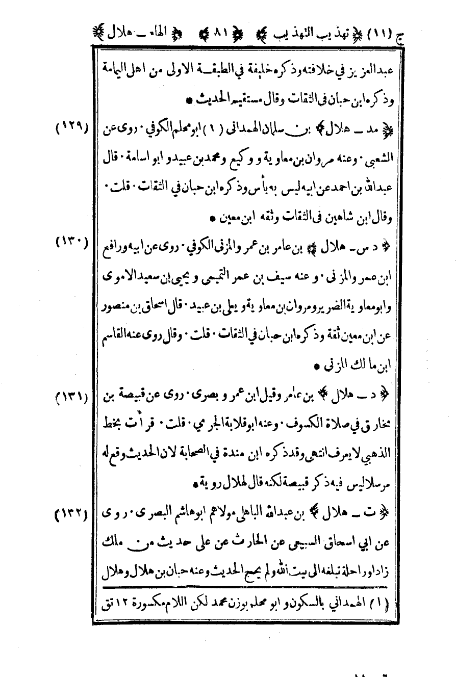 129-"مد – هلال" بن سلمان الهمداني1 أبو محلم الكوفي روى عن الشعبي وعنه مروان بن معاوية ووكيع ومحمد بن عبيد وأبو أسامة قال عبد الله بن أحمد عن أبيه: ليس به بأس وذكره بن حبان في الثقات قلت: وقال بن شاهين في الثقات وثقه بن معين.