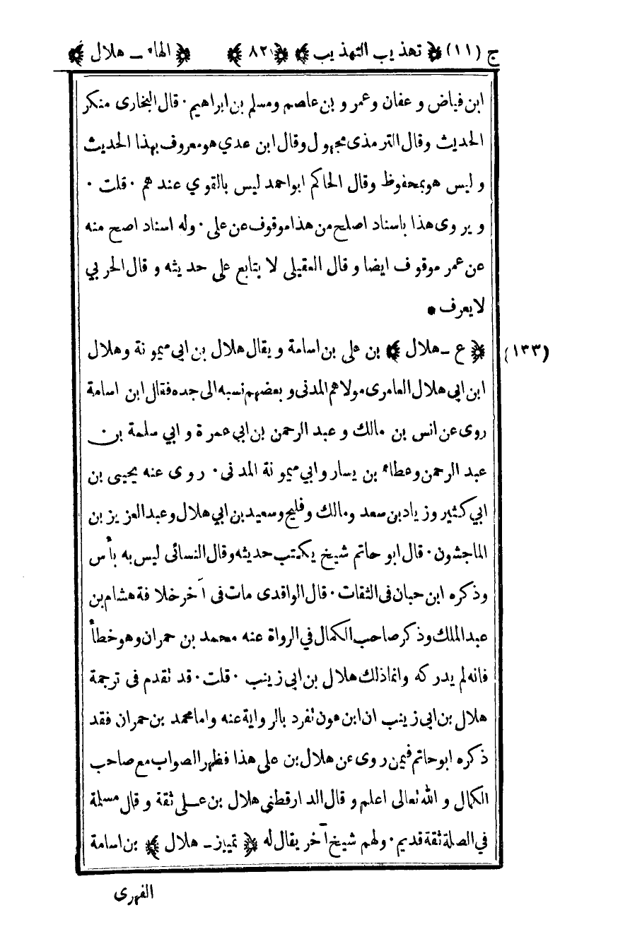 133-"ع – هلال" بن علي بن أسامة ويقال هلال بن أبي ميمونة وهلال بن أبي هلال العامري مولاهم المدني وبعضهم نسبه إلى جده فقال بن أسامة روى عن أنس بن مالك وعبد الرحمن بن أبي عمرة وأبي سلمة بن عبد الرحمن وعطاء بن يسار وأبي ميمونة المدني روى عنه يحيى بن أبي كثير وزياد بن سعد ومالك وفليح وسعيد بن أبي هلال وعبد العزيز بن الماجشون قال أبو حاتم: شيخ يكتب حديثه وقال النسائي: ليس به بأس وذكره بن حبان في الثقات قال الواقدي مات في آخر خلافة هشام بن عبد الملك وذكر صاحب الكمال في الرواة عنه محمد بن حمران وهو خطأ فإنه لم يدركه وإنما ذلك هلال بن أبي زينب قلت: قد تقدم في ترجمة هلال بن أبي زينب أن بن عون تفرد بالرواية عنه وأما محمد بن حمران فقد ذكره أبو حاتم فيمن روى عن هلال بن علي هذا فظهر الصواب مع صاحب الكمال والله تعالى أعلم وقال الدارقطني: هلال بن علي ثقة وقال مسلمة في الصلة ثقة قديم ولهم شيخ يقال له تمييز هلال بن أسامة