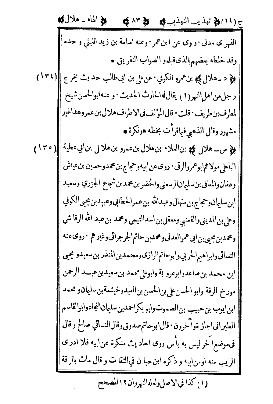 134 – "د – هلال" بن عمرو الكوفي عن علي بن أبي طالب حديث يخرج من أهل النهر1 يقال له الحارث الحديث وعنه أبو الحسن شيخ لمطرف بن طريف قلت: قال المؤلف في الأطراف هلال بن عمر وهذا غير مشهور وقال الذهبي فيما قرأت بخطه هو نكرة.