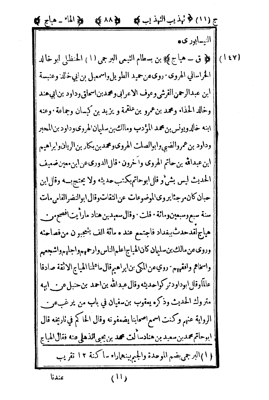 147 - "ق - هياج" بن بسطام التيمي البرجمي1 الحنظلي أبو خالد الخراساني الهروي روى عن حميد الطويل وإسماعيل بن أبي خالد وعنبسة بن عبد الرحمن القرشي وعوف الأعرابي ومحمد بن إسحاق وداود بن أبي هند وخالد الحذاء ومحمد بن عمرو بن علقمة ويزيد بن كيسان وجماعة وعنه ابنة خالد ويونس بن محمد المؤدب ومالك بن سليمان الهروي وداود بن المحبر وداود بن عمرو الضبي وأبو الصلت الهروي ومحمد بن بكار بن الريان وإبراهيم بن عبد الله بن حاتم الهروي وآخرون قال الدوري عن بن معين: ضعيف الحديث ليس بشيء وقال أبو حاتم: يكتب حديثه ولا يحتج به وقال بن حبان كان مرجئا يروي الموضوعات عن الثقات وقال أبو النضر الفامي مات سنة سبع وسبعين ومائة قلت: وقال سعيد بن هناد ما رأيت أفصح من هياج لقد حدث ببغداد فاجتمع عنده مائة ألف يتعجبون من فصاحته وروى عن مالك بن سليمان كان الهياج أعلم الناس وأرحمهم وأجلهم وأشجعهم وأسخاهم وأفقههم روى عن المكي بن إبراهيم قال ما علمنا الهياج إلا ثقة صادقا عالما وقال أبو داود تركوا حديثه وقال عبد الله بن أحمد بن حنبل عن أبيه متروك الحديث وذكره يعقوب بن سفيان في باب من يرغب عن الرواية عنهم وكنت أسمع أصحابنا يضعفونه وقال الحاكم في تاريخه قال أبو حاتم: محمد بن سعيد بن هناد سألت محمد بن يحيى الذهلي عنه فقال الهياج