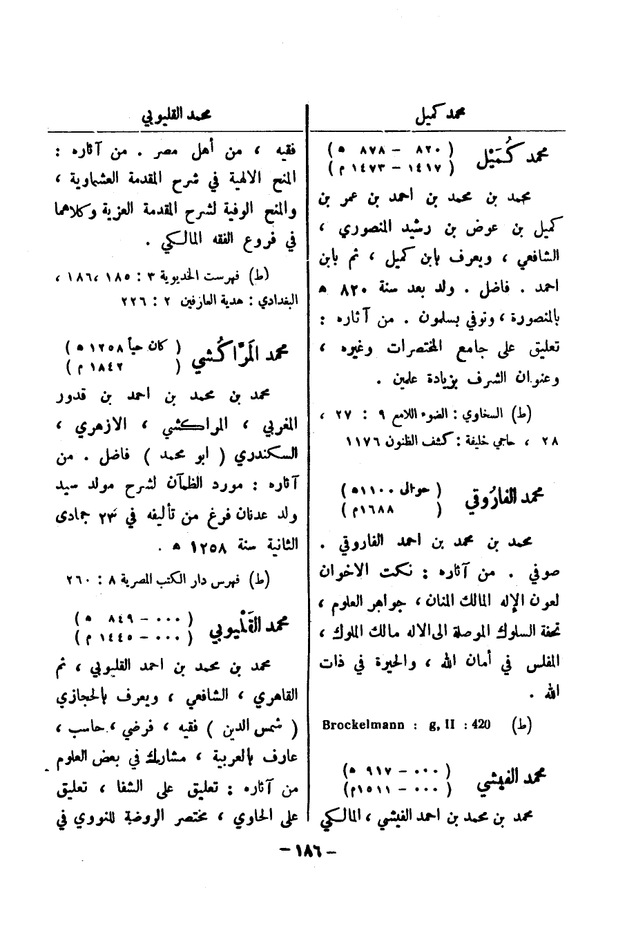 (ط) 420: Brockelmann: g , II محمد الفيشي (000 - 917 هـ) (000 - 1511 م) محمد بن محمد بن احمد الفيشي، المالكي فقيه، من أهل مصر.