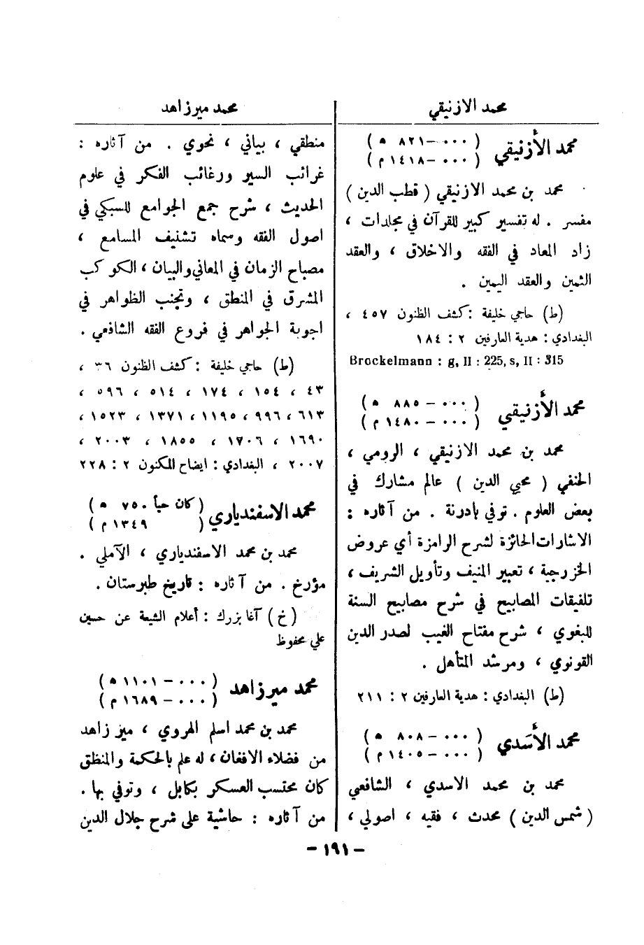 (ط) حاجي خليفة: كشف الظنون 36، 43، 154، 174، 514، 596، 613، 996، 1195، 1371، 1523، 1690، 1706، 1855، 2003، 2007، البغدادي: ايضاح المكنون 2: 228 محمد الاسفندياري (كان حيا 750 هـ) (1349 م)