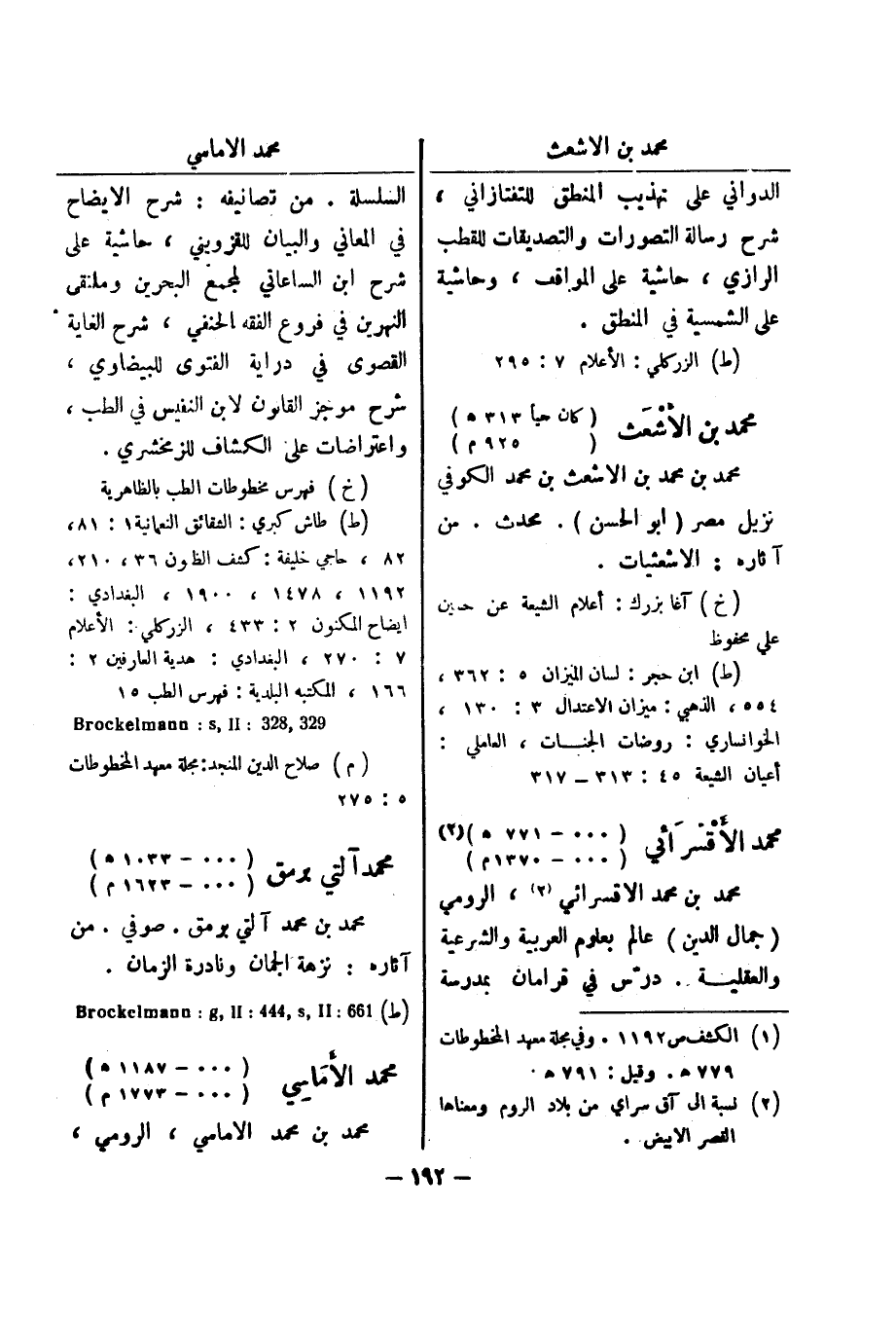 الدواني على تهذيب المنطق للتفتازاني، شرح رسالة التصورات والتصديقات للقطب الرازي، حاشية على المواقف، وحاشية على الشمسية في المنطق (ط) الزركلي: الاعلام 7: 295 محمد بن الاشعث (كان حيا 313 هـ) (925 م) محمد بن محمد بن الاشعث بن محمد الكوفي نزيل مصر (أبو الحسن) .