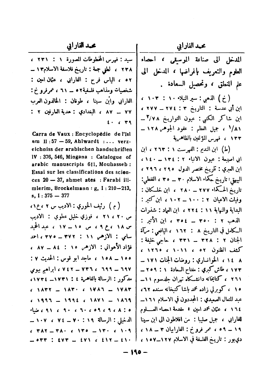 Essai sur les classifications des scien - ces 02 - 73 , ahmet ates: Farabi ili 377 - 375: s , I , 213 - 210: mlerim , Brockelmann: g , I (م) رئيف الخوري: الاديب س 2، ع 1، ص 20، 21، فوزي خليل عطوي: الاديب س 18، ع 9، ص 15 - 17، عبد الحميد سامي: الازهر 11: 372 - 375، احمد فؤاد الاهواني: الازهر 15: 84 - 87، 155 - 158، ماجد أبو قوس: الحديث 7: 697 - 699، 736 - 742، ابراهيم بيومي مذكور: الرسالة بالقاهرة 4: 1731 - 1734، 1783 - 1786، 1830 - 1832، 1869 - 1871، 1994 - 1996، 5: 8، 9، 59، 60، 90، 91، ضياء الدخيلي: الرسالة 19: 70 - 74، 107 - 109، 130 - 135، 380، 382، 410 - 412، 471 - 473: 533 -