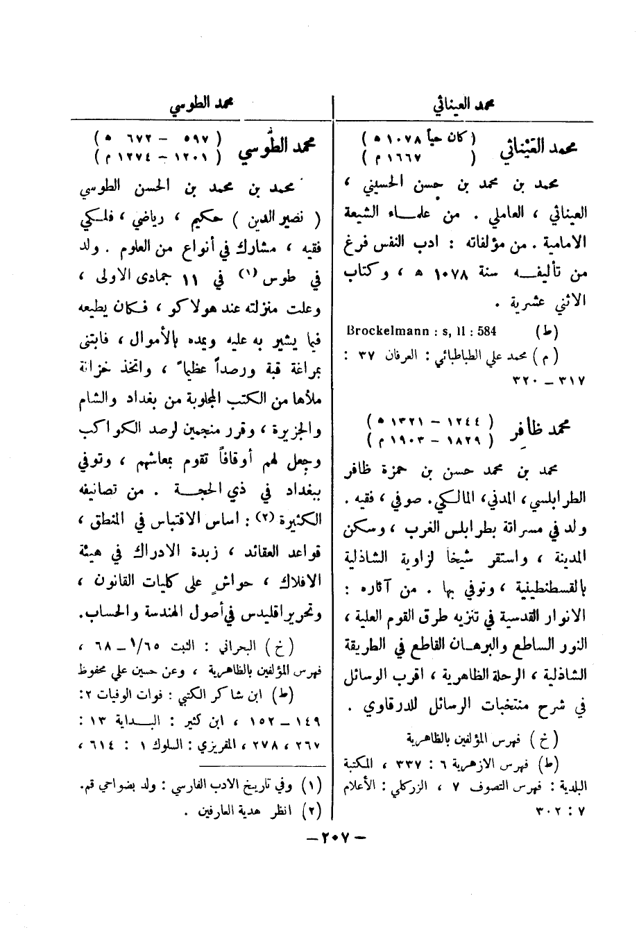 (ط) 584: Brockelmann: s , II (م) محمد علي الطباطبائي: العرفان 37: 317 - 320 محمد ظافر (1244 - 1321 هـ) (1829 - 1903 م) محمد بن محمد حسن بن حمزة ظافر الطرابلسي، المدني، المالكي.