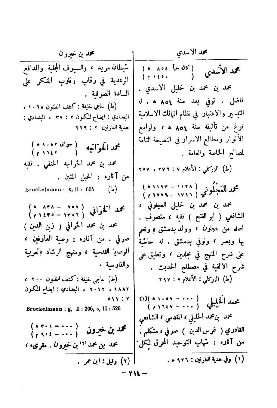 (ط) الزركلي: الاعلام 7: 276، 277 محمد العجلوني (1128 - 1193 هـ) (1716 - 1779 م) محمد بن محمد خليلي، العجلوني، الشافعي (أبو الفتح) فقيهه، متصوف.