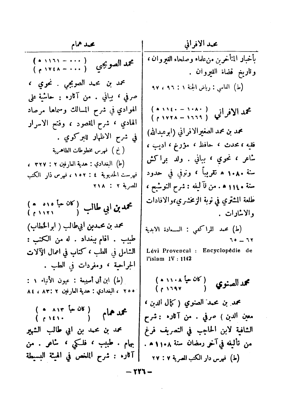 ) (ط) ابن أبي أصيبعة: عيون الانباء 1: 255، البغدادي: هدية العارفين 2: 83، 84 محمد همام (كان حيا 813 هـ) (1410 م) محمد بن محمد بن ابي طالب الشهير بهام.