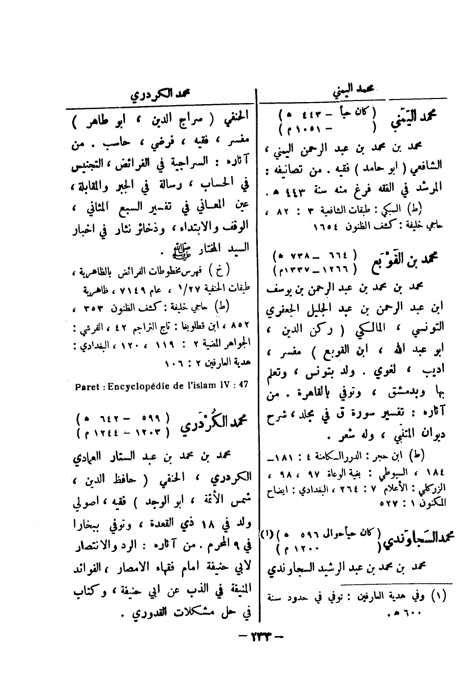 (خ) فهرس المخطوطات الفرائض بالظاهرية، طبقات الحنفية 27 / 1، عام 7149، ظاهرية (ط) حاجي خليفة: كشف الظنون 353، 852، ابن قطلوبغا: تاج التراجم 42، القرشي: الجواهر المضية 2: 119، 120، البغدادي: هدية العارفين 2: 106 46: paret: Encyclopedie de l ' islam IV محمد الكردري (599 - 642 هـ)