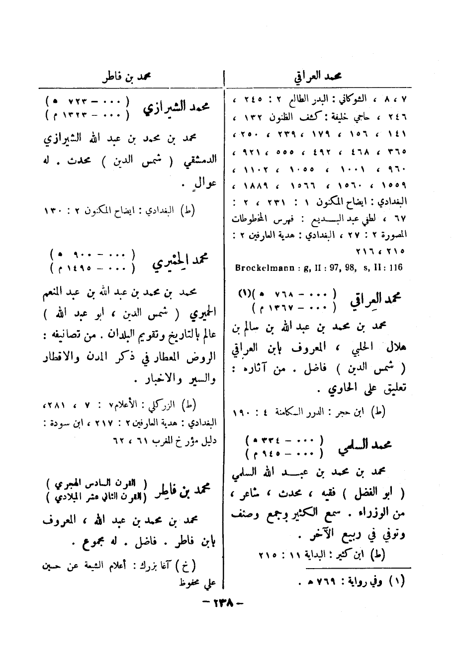 7، 8، الشوكاني: البدر الطالع 2: 245، 246، حاجي خليفة: كشف الظنون 132، 141، 156، 179، 239، 250، 365، 468، 492، 555، 921، 960، 1001، 1055، 1102، 1559، 1560، 1566، 1889، البغدادي: ايضاح المكنون 1: 231، 2: 67، لطفي عبد البديع: فهرس المخطوطات المصورة 2: 27، البغدادي: هدية العارفين 2: 215، 216 116: Brockelmann: g , II: 69 , 89 , s , II محمد العراقي (000 - 768 هـ) (1) (000 - 1367 م)