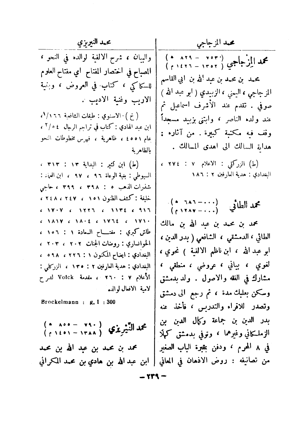 (ط) ابن كثير: البداية 13: 313، السيوطي: بغية الوعاة 96، 97، ابن العماد: شذرات الذهب 5: 398، 399، حاجي خليفة: كشف الظنون 151، 247، 248، 916، 1134، 1226، 1707، 1710، 1764، 1804، 1817 طاش كبري: مفتاح السعادة 1: 156، الخوانساري: روضات الجنات 202، 203، البغدادي: ايضاح المكنون 1: 226، 598 البغدادي: هدية العارفين 2: 135، الزركلي: الاعلام 7: 260، مقدمة Volck لشرح لامية الافعال لوالده 300: Brockelmann: g , I محمد النيريزي (790 - 855 هـ) (1388 - 1451 م) محمد بن محمد بن عبد الله بن محمد ابن عبد الله بن هادي بن محمد المكراني