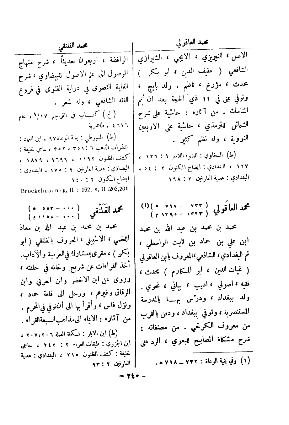 (ط) السخاوي: الضوء اللامع 9: 126، 127، البغدادي: ايضاح المكنون 2: 54، البغدادي: هدية العارفين 2: 198 محمد العاقولي (733 - 797 هـ) (1) (1323 - 1395 م) محمد بن محمد بن عبد الله بن محمد ابن علي بن حماد بن ثابت الواسطي، ثم البغدادي، الشافعي، المعروف بابن العاقولي (غياث الدين، أبو المكارم) محدث، فقيه، اصولي، اديب، بياني، نحوي ولد ببغداد، ودرس بها بالمدرسة المستنصرية، وتوفي ببغداد، ودفن بالقرب من معروف الكرخي.