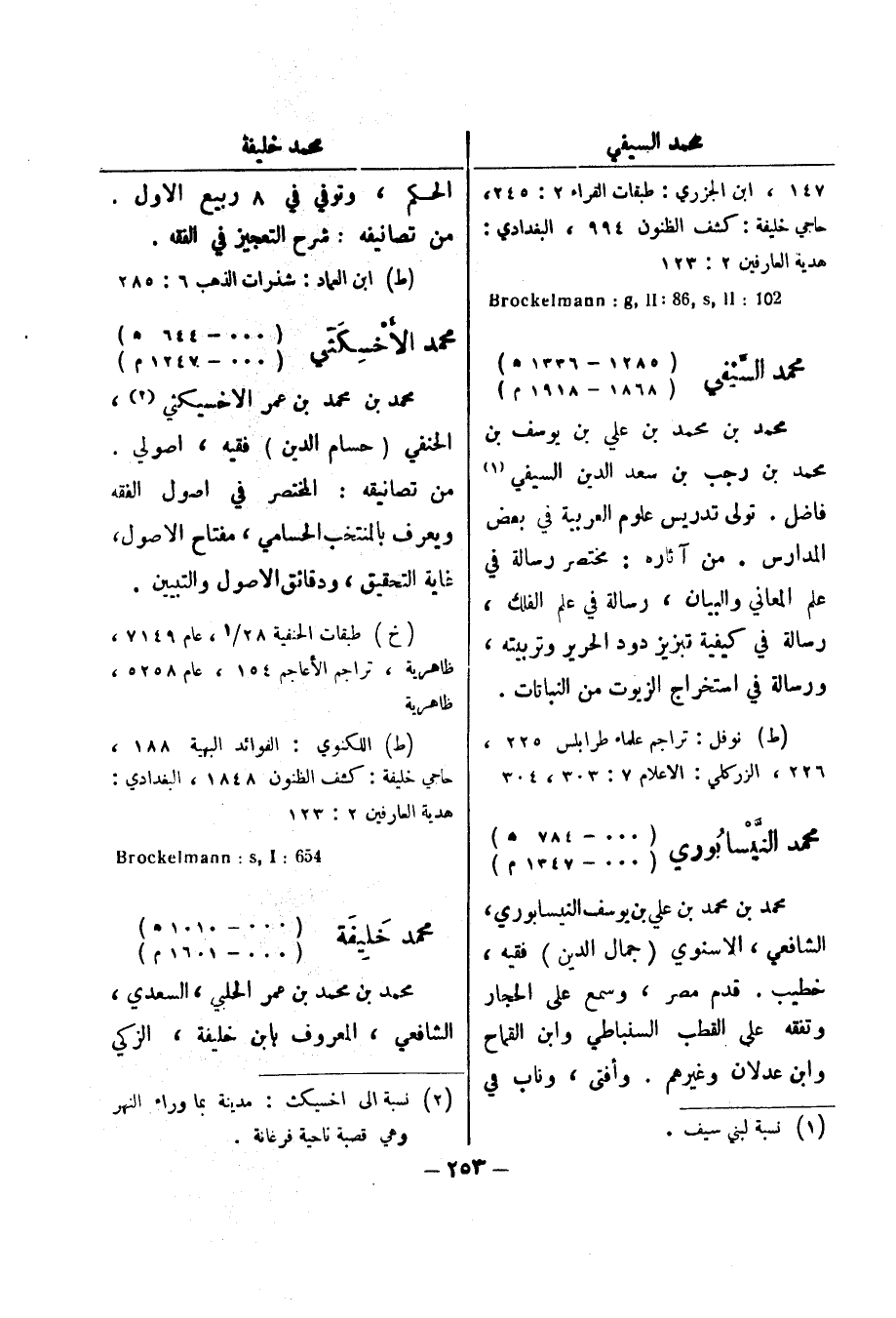 من تصانيفه: شرح التعجيز في الفقه (ط) ابن العماد: شذرات الذهب 6: 285 محمد الاخسكثي (000 - 644 هـ) (000 - 1247 م) محمد بن محمد بن عمر الاخسيكثي (2) ، الحنفي (حسام الدين) فقيه، اصولي من تصانيفه: المختصر في اصول الفقه ويعرف بالمنتخب الحسامي، مفتاح الاصول، غاية التحقيق، ودقائق الاصول والتبيين (خ) طبقات الحنفية 28 / 1، عام 7149، ظاهرية، تراجم الاعاجم 154، عام 5258، ظاهرية (ط) اللكنوي: الفوائد البهية 188، حاجي خليفة: كشف الظنون 1848، البغدادي: هدية العارفين 2: 123 654: Brockelmann: s , I محمد خليفة (000 - 1010 هـ) (000 - 1601 م) محمد بن محمد بن عمر الحلبي، السعدي، الشافعي، المعروف بابن خليفة، الزكي