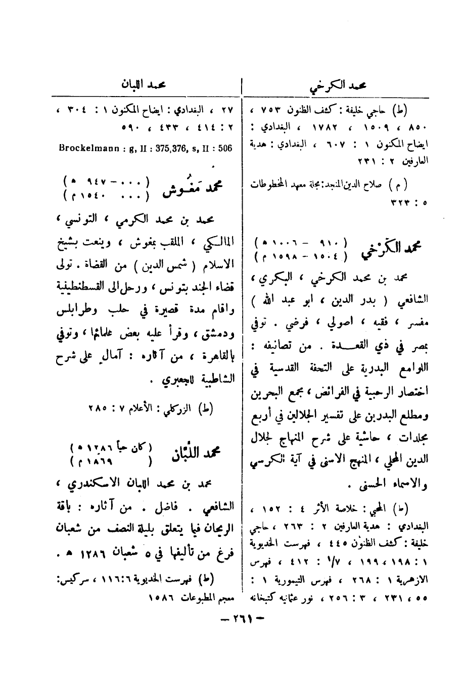 (ط) حاجي خليفة: كشف الظنون 753، 850، 1509، 1782، البغدادي: ايضاح المكنون 1: 607، البغدادي: هدية العارفين 2: 231 (م) صلاح الدين المنجد: مجلة معهد المخطوطات 5: 323 محمد الكرخي (910 - 1006 هـ) (1504 - 1598 م) محمد بن محمد الكرخي، البكري، الشافعي (بدر الدين، أبو عبد الله) مفسر، فقيه، اصولي، فرضي.