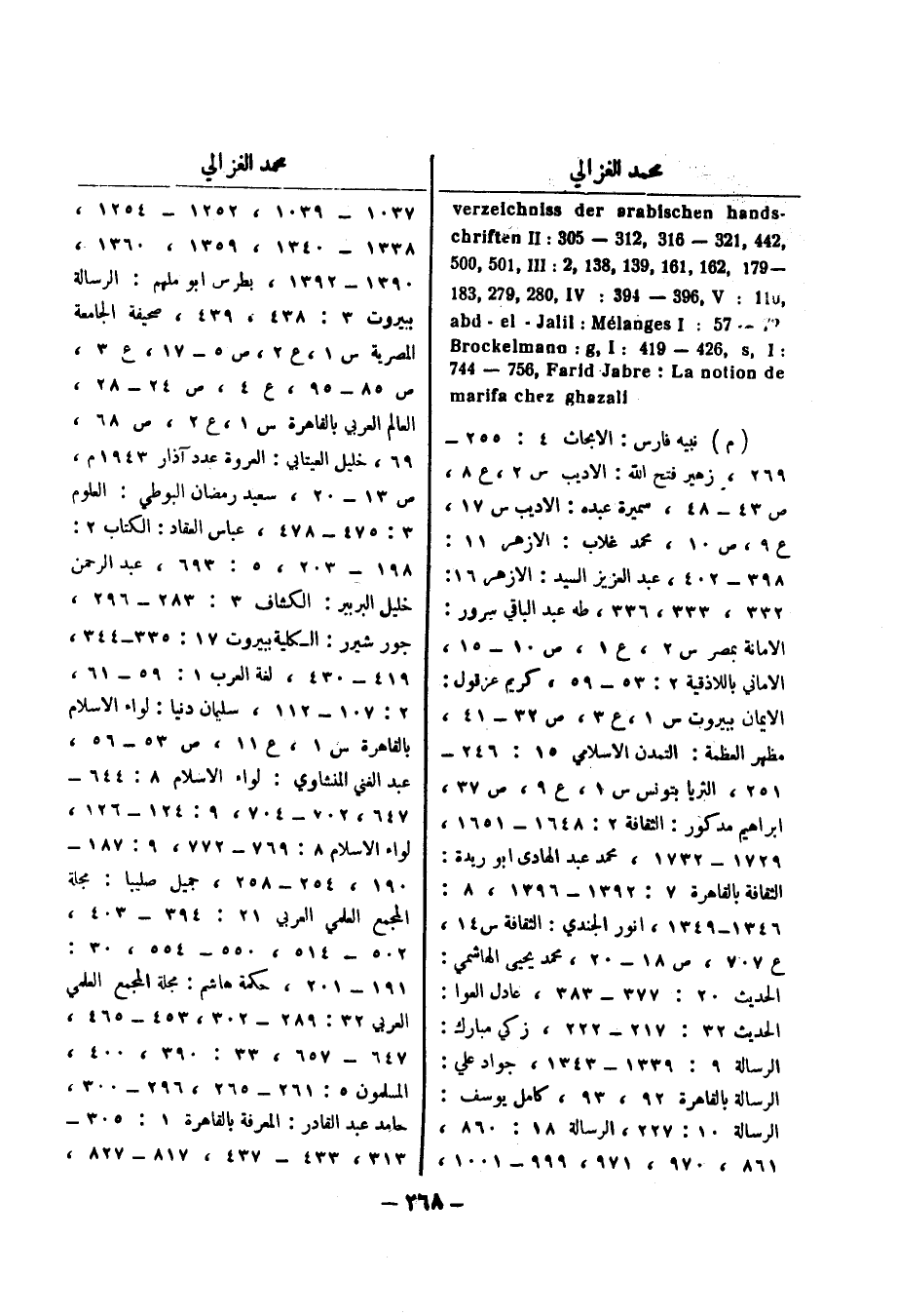 , 442 , 321 - 316 , 312 - 305: chriften II - 179 , 162 , 161 , 139 , 138 , 2: 005 , 105 , III 110: 381 , 972 , 082 , IV: 493 - 693 , v 79 - 57: abd - el - Jalil: Melanges I: Brockelmann: g , I: 914 - 624 , s , I marifa chez ghazali 447 - 657 , Farid Jabre: La notion de (م) نبيه فارس: الابحاث 4: 255 - 269، زهير فتح الله: الاديب س 2، ع 8، ص 43 - 48، سميرة عبده: الاديب س 17، ع 9، ص 10، محمد غلاب: الازهر 11: 398 - 402، عبد العزيز السيد: الازهر 16: 332 و 333 و 336، طه عبد الباقي سرور: الامانة بمصر س 2، ع 1، ص 10 - 15 الاماني باللاذقية 2: 53 - 59، كريم عزقول:.