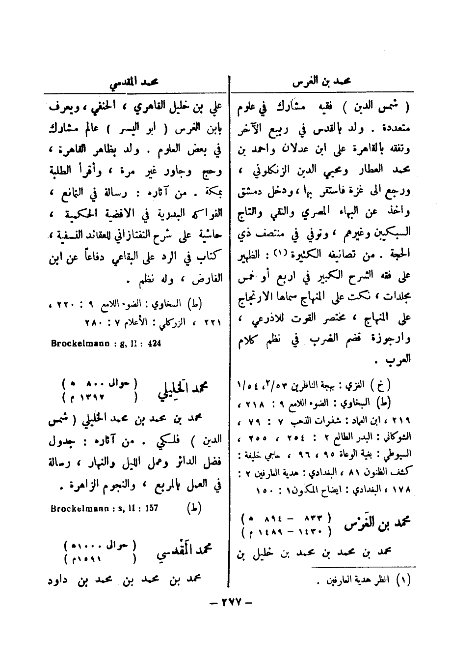 (ط) السخاوي: الضوء اللامع 9: 220، 221، الزركلي: الاعلام 7: 280 424: Brockelmann: g , II محمد الخليلي (حوالى 800 هـ) (1397 م) محمد بن محمد بن محمد الخليلي (شمس الدين) فلكي.