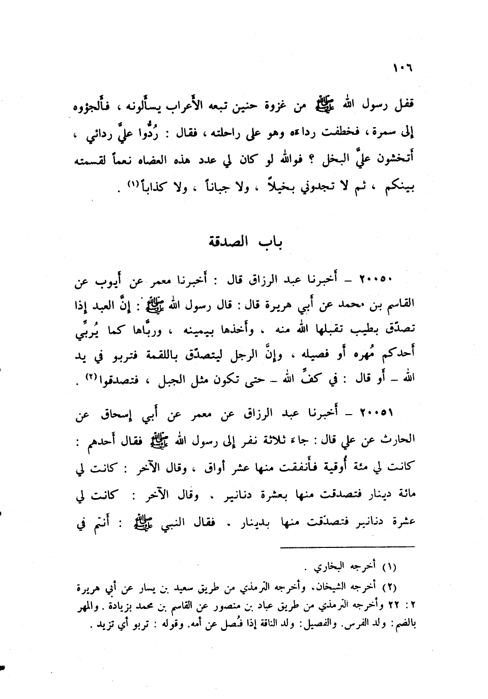 ٢٠٠٥٠ - أَخْبَرَنَا عَبْدُ الرَّزَّاقِ، قَالَ: أَخْبَرَنَا مَعْمَرٌ، عَنْ أَيُّوبَ، عَنِ الْقَاسِمِ بْنِ مُحَمَّدٍ، عَنْ أَبِي هُرَيْرَةَ، قَالَ: قَالَ رَسُولُ اللَّهِ صَلَّى اللهُ عَلَيْهِ وَسَلَّمَ: «إِنَّ الْعَبْدَ إِذَا تَصَدَّقَ بِطَيِّبٍ تَقَبَّلَهَا اللَّهُ مِنْهُ، وَأَخَذَهَا بيمينه ورباها كَمَا يُرَبِّي أَحَدُكُمْ مُهْرَهُ، أَوْ فَصِيلَهُ، وَإِنَّ الرَّجُلَ لَيَتَصَدَّقُ بِاللُّقْمَةِ، فَتَرْبُو فِي يَدِ اللَّهِ - أَوْ قَالَ: فِي كَفِّ اللَّهِ - حَتَّى تَكُونَ مِثْلَ الْجَبَلِ، فَتَصَدَّقُوا»