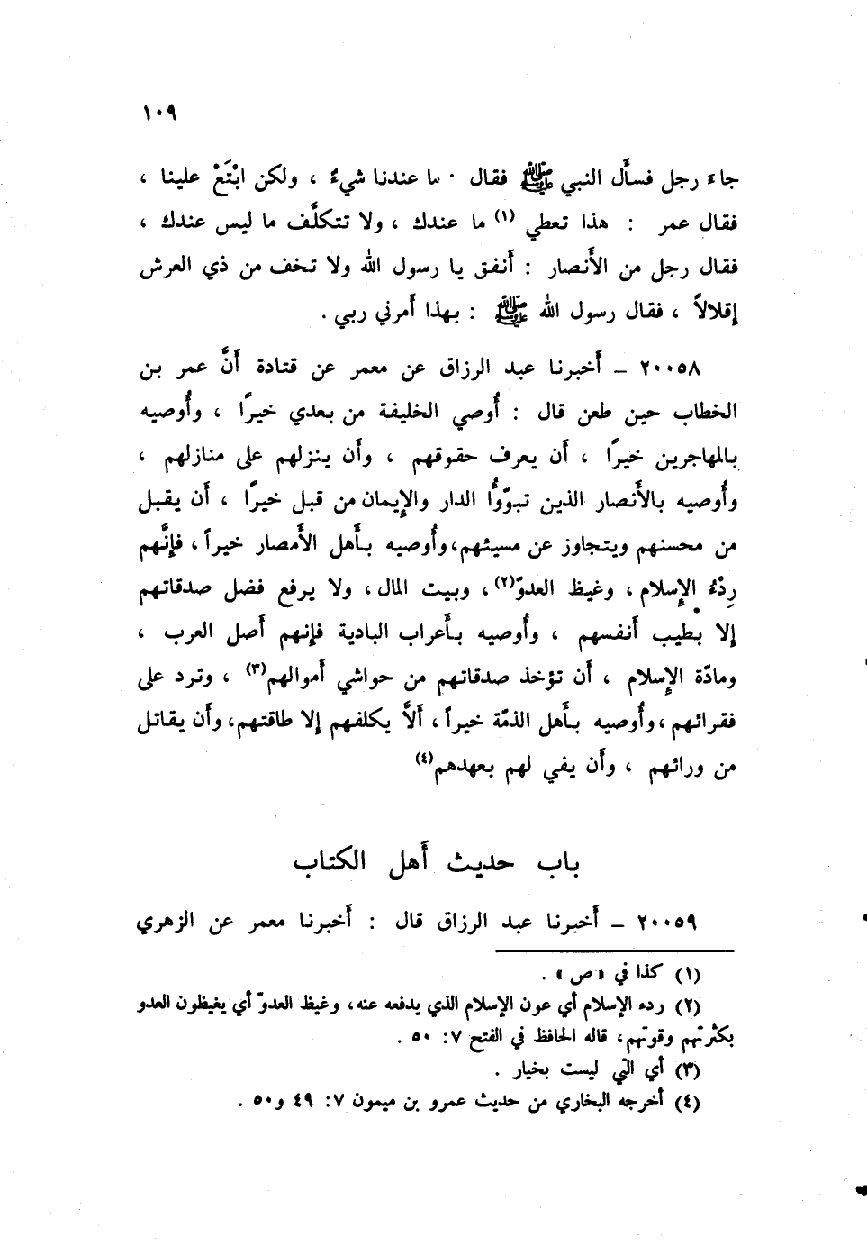 ٢٠٠٥٨ - أَخْبَرَنَا عَبْدُ الرَّزَّاقِ، عَنْ مَعْمَرٍ، عَنْ قَتَادَةَ، أَنَّ عُمَرَ بْنَ الْخَطَّابِ، حِينَ طُعِنَ قَالَ: «أُوصِي الْخَلِيفَةَ مِنْ بَعْدِي خَيْرًا، وَأُوصِيهِ بِالْمُهَاجِرِينَ خَيْرًا، أَنْ يَعْرِفَ حُقُوقَهُمْ، وَأَنْ يُنزِلَهُمْ عَلَى مَنَازِلِهِمْ، وَأُوصِيهِ بِالْأَنْصَارِ الَّذِينَ تَبَوَّءُوا الدَّارَ وَالْإِيمَانَ مِنْ قَبْلُ خَيْرًا، أَنْ يَقْبَلَ مِنْ مُحْسِنِهِمْ، وَيَتَجَاوَزَ عَنْ مُسِيئِهِمْ، وَأُوصِيهِ بِأَهْلِ الْأَمْصَارِ خَيْرًا، فَإِنَّهُمْ رِدْءُ الْإِسْلَامِ، وَغَيْظُ الْعَدُوِّ، وَبَيْتُ الْمَالِ، وَلَا يَرْفَعُ فَضْلَ صَدَقَاتِهِمْ إِلَّا بِطِيبِ أَنْفُسِهِمْ، وَأُوصِيهِ بَأَعْرَابِ الْبَادِيَةِ، فَإِنَّهُمْ أَصْلُ الْعَرَبِ، وَمَادَّةُ الْإِسْلَامِ، أَنْ تُؤْخَذَ صَدَقَاتُهُمْ مِنْ حَوَاشِي أَمْوَالِهِمْ، وَتُرَدَّ عَلَى فُقَرَائِهِمْ، وَأُوصِيهِ بِأَهْلِ الذِّمَّةِ خَيْرًا، أَلَّا يُكَلِّفَهُمْ إِلَّا طَاقَتَهُمْ، وَأَنْ يُقَاتِلَ مِنْ وَرَائِهِمْ، وَأَنْ يَفِيَ لَهُمْ بِعَهْدِهِمْ»