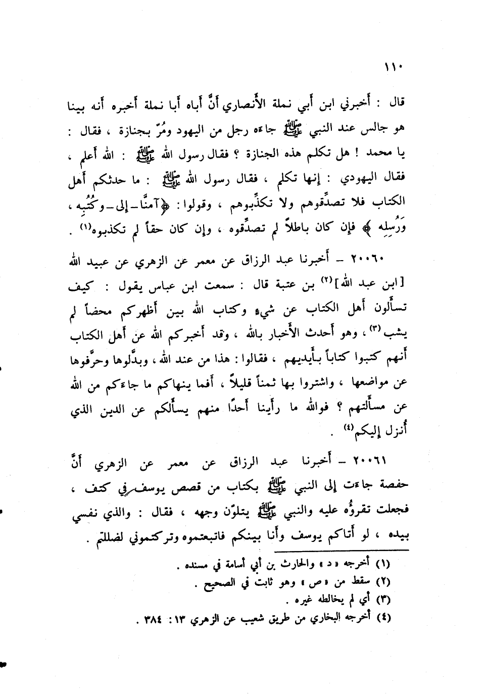 ٢٠٠٦١ - أَخْبَرَنَا عَبْدُ الرَّزَّاقِ، قَالَ: أَخْبَرَنَا مَعْمَرٌ، عَنِ الزُّهْرِيِّ، أَنَّ حَفْصَةَ، جَاءَتْ إِلَى النَّبِيِّ صَلَّى اللهُ عَلَيْهِ وَسَلَّمَ بِكِتَابٍ مِنْ قَصَصِ يُوسُفَ فِي كَتِفٍ، فَجَعَلَتْ تَقْرَؤُهُ عَلَيْهِ، وَالنَّبِيُّ صَلَّى اللهُ عَلَيْهِ وَسَلَّمَ يَتَلَوَّنُ وَجْهُهُ، فَقَالَ: «وَالَّذِي نَفْسِي بِيَدِهِ، لَوْ أَتَاكُمْ يُوسُفُ وَأَنَا بَيْنَكُمْ فَاتَّبَعْتُمُوهُ وَتَرَكْتُمُونِي لَضَلَلْتُمْ»
