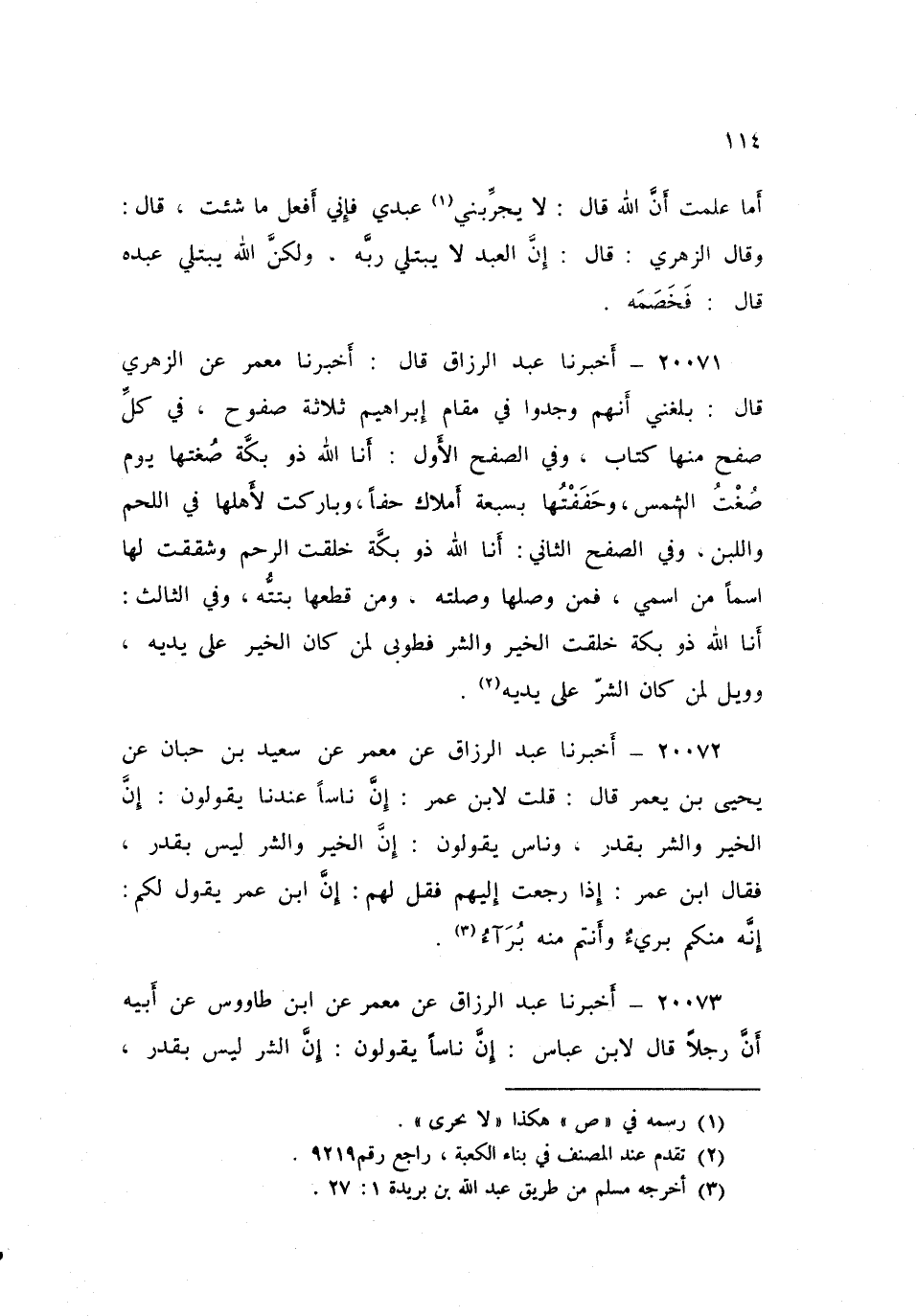 ٢٠٠٧١ - أَخْبَرَنَا عَبْدُ الرَّزَّاقِ، قَالَ: أَخْبَرَنَا مَعْمَرٌ، عَنِ الزُّهْرِيِّ، قَالَ: «بَلَغَنِي أَنَّهُمْ وَجَدُوا فِي مَقَامِ إِبْرَاهِيمَ ثَلَاثَةَ صُفُوحٍ فِي كُلِّ صَفْحٍ مِنْهَا كِتَابٌ، وَفِي الصَّفْحِ الْأَوَّلِ: أَنَا اللَّهُ ذُو بَكَّةَ صُغْتُهَا يَوْمَ صُغْتُ الشَّمْسَ، وَحَفَفْتُهَا بِسَبْعَةِ أَمْلَاكٍ حفًّا، وَبَارَكْتُ لِأَهْلِهَا فِي اللَّحْمِ وَاللَّبَنِ، وَفِي الصَّفْحِ الثَّانِي: أَنَا اللَّهُ ذُو بَكَّةَ، خَلَقْتُ الرَّحِمَ، وَشَقَقْتُ لَهَا اسْمًا مِنِ اسْمِي، فَمَنْ وَصَلَهَا وَصَلْتُهُ، وَمَنْ قَطَعَهَا بَتَتُّهُ، وَفِي الثَّالِثِ: أَنَا اللَّهُ ذُو بَكَّةَ خَلَقْتُ الْخَيْرَ وَالشَّرَّ، فَطُوبَى لِمَنْ كَانَ الْخَيْرُ عَلَى يَدَيْهِ، وَوَيْلٌ لِمَنْ كَانَ الشَّرُّ عَلَى يَدَيْهِ»