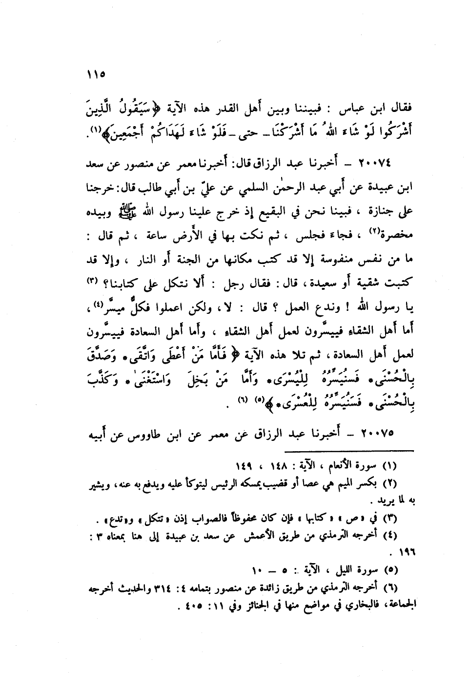 ٢٠٠٧٤ - أَخْبَرَنَا عَبْدُ الرَّزَّاقِ، قَالَ: أَخْبَرَنَا مَعْمَرٌ، عَنْ مَنْصُورٍ، عَنْ سَعْدِ بْنِ عُبَيْدَةَ، عَنْ أَبِي عَبْدِ الرَّحْمَنِ السُّلَمِيِّ، عَنْ عَلِيِّ بْنِ أَبِي طَالِبٍ، قَالَ: خَرَجْنَا عَلَى جِنَازَةٍ، فَبَيْنَا نَحْنُ فِي الْبَقِيعِ إِذْ خَرَجَ عَلَيْنَا رَسُولُ اللَّهِ صَلَّى اللهُ عَلَيْهِ وَسَلَّمَ، وَبِيَدِهِ مِخْصَرَةٌ، فَجَاءَ فَجَلَسَ، ثُمَّ نَكَثَ بِهَا فِي الْأَرْضِ سَاعَةً، ثُمَّ قَالَ: «مَا مِنْ نَفْسٍ مَنْفُوسَةٍ إِلَّا قَدْ كُتِبَ مَكَانُهَا مِنَ الْجَنَّةِ أَوِ النَّارِ، وَإِلَّا قَدْ كُتِبَتْ شَقِيَّةً أَوْ سَعِيدَةً» قَالَ: فَقَالَ رَجُلٌ: أَلَا نَتَّكِلُ عَلَى كِتَابِنَا يَا رَسُولَ اللَّهِ، وَنَدَعُ الْعَمَلَ؟ قَالَ: «لَا، وَلَكِنِ اعْمَلُوا، فَكُلٌّ مُيَسَّرٌ، أَمَّا أَهْلُ الشَّقَاءِ فَيُيَسَّرُونَ لِعَمَلِ أَهْلِ الشَّقَاءِ، وَأَمَّا أَهْلُ السَّعَادَةِ فَيُيَسَّرُونَ لِعَمَلِ أَهْلِ السَّعَادَةِ» ، ثُمَّ تَلَا هَذِهِ الْآيَةَ: {فَأَمَّا مَنْ أَعْطَى وَاتَّقَى وَصَدَّقَ بِالْحُسْنَى فَسَنُيَسِّرُهُ لِلْيُسْرَى وَأَمَّا مَنْ بَخِلَ وَاسْتَغْنَى وَكَذَّبَ بِالْحُسْنَى فَسَنُيَسِّرُهُ لِلْعُسْرَى} [الليل: ٦]