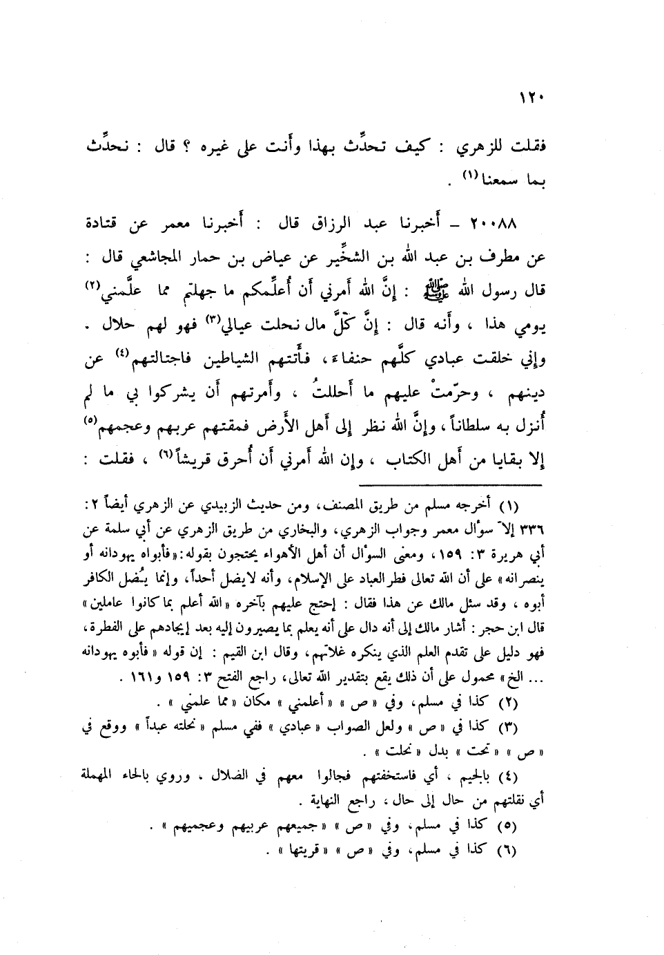 ٢٠٠٨٨ - أَخْبَرَنَا عَبْدُ الرَّزَّاقِ، قَالَ: أَخْبَرَنَا مَعْمَرٌ، عَنْ قَتَادَةَ، عَنْ مُطَرِّفِ بْنِ عَبْدِ اللَّهِ بْنِ الشِّخِّيرِ، عَنْ عِيَاضِ بْنِ حِمَارٍ الْمُجَاشِعِيِّ، قَالَ: قَالَ رَسُولُ اللَّهِ صَلَّى اللهُ عَلَيْهِ وَسَلَّمَ: «إِنَّ اللَّهَ أَمَرَنِي أَنْ أُعَلِّمَكُمْ مَا جَهِلْتُمْ مِمَّا عَلَّمَنِي يَوْمِي هَذَا، وَأَنَّهُ قَالَ: إِنَّ كُلَّ مَالٍ نَحَلْتُ عِيَالِي فَهُوَ لَهُمْ حَلَالٌ، وَإِنِّي خَلَقْتُ عِبَادِي كُلَّهُمْ حُنَفَاءَ، فأَتَتْهُمُ الشَّيَاطِينُ فَاجْتَالَتْهُمْ عَنْ دِينِهِمْ، وَحَرَّمَتْ عَلَيْهِمْ مَا أَحْلَلْتُ، وَأَمَرَتْهُمْ أَنْ يُشْرِكُوا بِي مَا لَمْ أُنَزِّلْ بِهِ سُلْطَانًا، وَإِنَّ اللَّهَ نَظَرَ إِلَى أَهْلِ الْأَرْضِ فَمَقَتَهُمْ عَرَبَهُمْ وَعَجَمَهُمْ إِلَّا بَقَايَا مِنْ أَهْلِ الْكِتَابِ، وَإِنَّ اللَّهَ أَمَرَنِي أَنْ أُحَرِّقَ قُرَيْشًا، فَقُلْتُ: ⦗١٢١⦘ يَا رَبِّ، إِذًا يَثْلَغُوا رَأْسِي حَتَّى يَدْعُوهُ خُبْزَةً، فَقَالَ: إِنَّمَا بَعَثْتُكَ لِأَبْتَلِيَكَ وَأَبْتَلِيَ بِكَ، وَقَدْ أَنْزَلْتُ عَلَيْكَ كِتَابًا لَا يَغْسِلُهُ الْمَاءُ، تَقْرَؤُهُ فِي الْمَنَامِ وَالْيَقَظَةِ، وَاغْزُهُمْ نُغْزِكَ، وَأَنْفِقْ يُنْفَقْ عَلَيْكَ، وَابْعَثْ جَيْشًا نُمْدِدْكَ بِخَمْسَةِ أَمْثَالِهِمْ، وَقَاتِلْ بِمَنْ أَطَاعَكَ مَنْ عَصَاكَ، ثُمَّ قَالَ: أَهْلُ الْجَنَّةِ ثَلَاثَةٌ: إِمَّام مُقْسِطٌ وَرَجُلٌ رَحِيمٌ رَقِيقُ الْقَلْبِ لِكُلِّ ذِي قُرْبَى وَمُسْلِمٍ، وَرَجُلٌ غَنِيُّ عَفِيفٌ مُتَصَدِّقٌ، وَأَهْلُ النَّارِ خَمْسَةٌ: الضَّعِيفُ الَّذِي لَا زَبْرَ لَهُ، الَّذِينَ هُمْ فِيكُمْ تَبَعٌ لَا يَبْتَغُونَ بِذَلِكَ أَهْلًا وَلَا مَالًا، وَرَجُلٌ إِنْ أَصْبَحَ أَصْبَحَ يُخَادِعُكَ عَنْ أَهْلِكَ وَمَالِكَ، وَرَجُلٌ لَا يَخْفَى لَهُ طَمَعٌ وَإِنْ دَقَّ إِلَّا ذَهَبَ بِهِ، وَالشِّنْظِيرُ الْفَاحِشُ، قَالَ: وَذَكَرَ الْبُخْلَ وَالْكَذِبَ»
