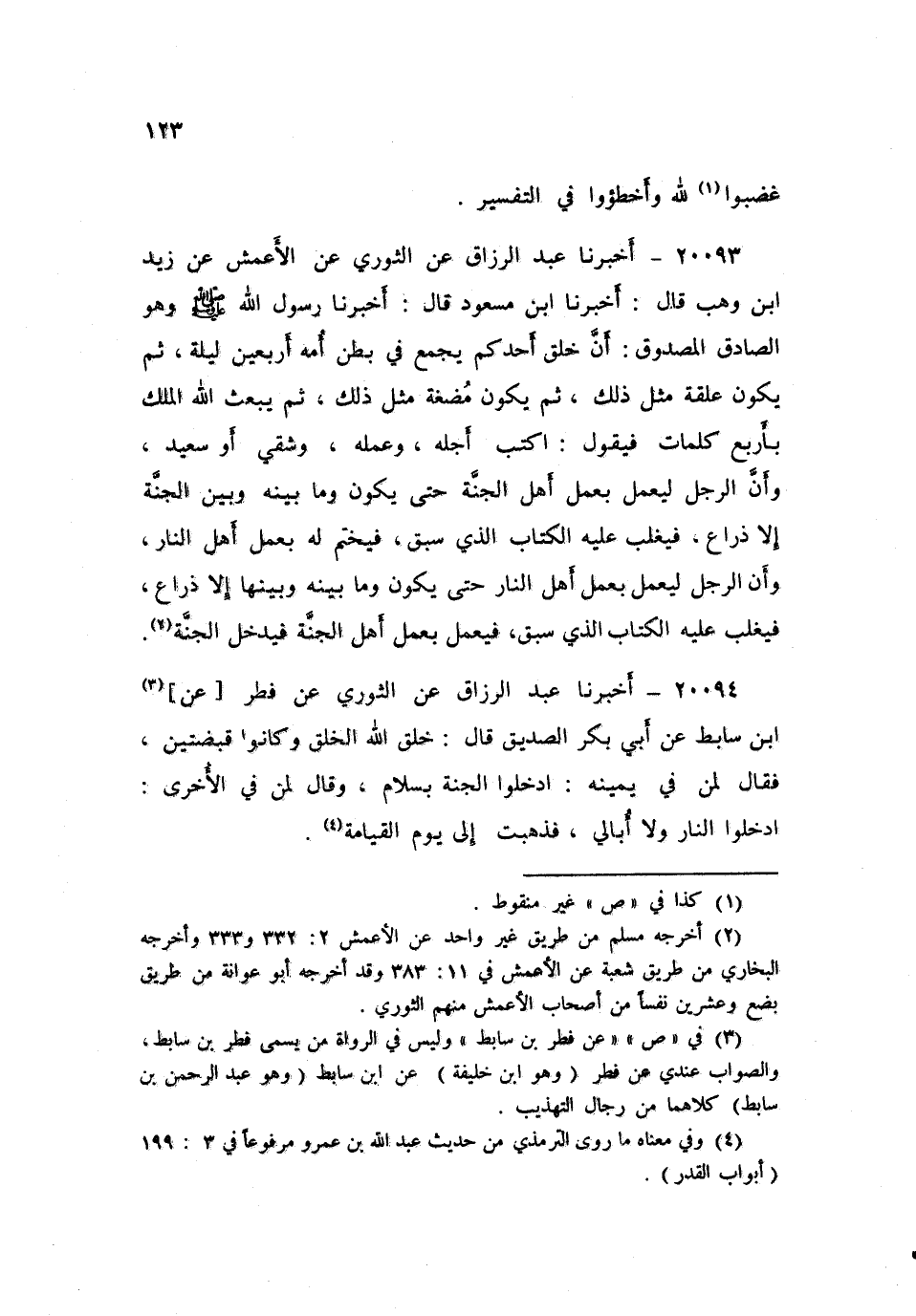 ٢٠٠٩٣ - أَخْبَرَنَا عَبْدُ الرَّزَّاقِ، عَنِ الثَّوْرِيِّ، عَنِ الْأَعْمَشِ، عَنْ زَيْدِ بْنِ وَهْبٍ، قَالَ: أَخْبَرَنَا ابْنُ مَسْعُودٍ، قَالَ: أَخْبَرَنَا رَسُولُ اللَّهِ صَلَّى اللهُ عَلَيْهِ وَسَلَّمَ وَهُوَ الصَّادِقُ الْمَصْدُوقُ: «إِنَّ خَلْقَ أَحَدِكُمْ يُجْمَعُ فِي بَطْنِ أُمِّهِ أَرْبَعِينَ لَيْلَةً، ثُمَّ يَكُونُ عَلَقَةً مِثْلَ ذَلِكَ، ثُمَّ يَكُونُ مُضْغَةً مِثْلَ ذَلِكَ، ثُمَّ يَبْعَثُ اللَّهُ الْمَلَكَ بِأَرْبَعِ كَلِمَاتٍ فَيَقُولُ: اكْتُبْ أَجَلَهُ وَعَمَلَهُ، وَشَقِيُّ أَوْ سَعِيدٌ، وَإِنَّ الرَّجُلَ لَيَعْمَلُ بِعَمَلِ أَهْلِ الْجَنَّةِ حَتَّى يَكُونَ وَمَا بَيْنَهُ وَبَيْنَ الْجَنَّةِ إِلَّا ذِرَاعٌ، فَيَغْلِبُ عَلَيْهِ الْكِتَابُ الَّذِي سَبَقَ، فَيُخْتَمُ لَهُ بِعَمَلِ أَهْلِ النَّارِ، وَإِنَّ الرَّجُلَ لَيَعْمَلُ بِعَمَلِ أَهْلِ النَّارِ حَتَّى يَكُونَ وَمَا بَيْنَهُ وَبَيْنَهَا إِلَّا ذِرَاعٌ، فَيَغْلِبُ عَلَيْهِ الْكِتَابُ الَّذِي سَبَقَ، فَيَعْمَلُ بِعَمَلِ أَهْلِ الْجَنَّةِ فَيَدْخُلُ الْجَنَّةَ»