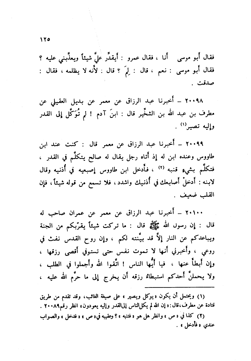 ٢٠٠٩٩ - أَخْبَرَنَا عَبْدُ الرَّزَّاقِ، عَنْ مَعْمَرٍ، قَالَ: كُنْتُ عِنْدَ ابْنِ طَاوُسٍ، وَعِنْدَهُ ابْنٌ لَهُ، إِذْ أَتَاهُ رَجُلٌ يُقَالُ لَهُ: صَالِحٌ، يَتَكَلَّمُ فِي الْقَدَرِ فَتَكَلَّمَ بِشَيْءٍ فَتَنَبَّهَ، فَأَدْخَلَ ابْنُ طَاوُسٍ إِصْبَعَيْهِ فِي أُذُنَيْهِ، وَقَالَ لِابْنِهِ: «أَدْخِلْ أَصَابِعَكَ فِي أُذُنَيْكَ وَاشْدُدْ، فَلَا تَسْمَعْ مِنْ قَوْلِهِ شَيْئًا فَإِنَّ الْقَلْبَ ضَعِيفٌ»