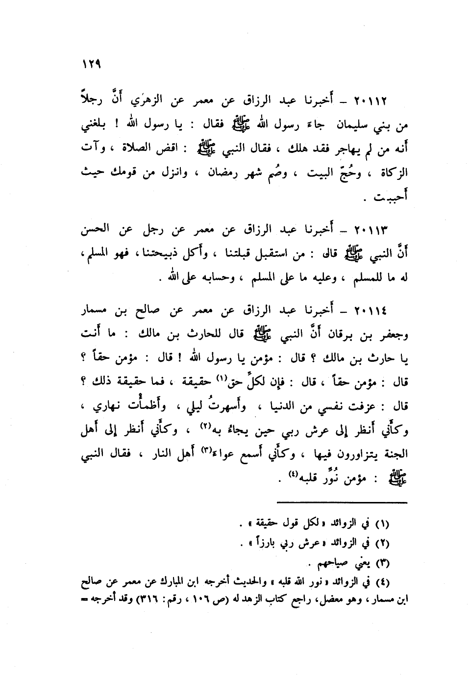 ٢٠١١٤ - أَخْبَرَنَا عَبْدُ الرَّزَّاقِ، عَنْ مَعْمَرٍ، عَنْ صَالِحِ بْنِ مِسْمَارٍ، وَجَعْفَرِ بْنِ بُرْقَانَ أَنَّ النَّبِيَّ صَلَّى اللهُ عَلَيْهِ وَسَلَّمَ قَالَ لِلْحَارِثِ بْنِ مَالِكٍ: «مَا أَنْتَ يَا حَارِثُ بْنَ مَالِكٍ؟» ، قَالَ: مُؤْمِنٌ يَا رَسُولَ اللَّهِ، قَالَ: «مُؤْمِنٌ حَقًّا؟» ، قَالَ: مُؤْمِنٌ حَقًّا، قَالَ: «فَإِنَّ لِكُلِّ حَقٍّ حَقِيقَةً، فَمَا حَقِيقَةُ ذَلِكَ؟» ، قَالَ: عَزَفَتْ نَفْسِي مِنَ الدُّنْيَا، وَأَسْهَرْتُ لِيَلِي، وَأَظْمَأْتُ نَهَارِي، وَكَأَنِّي أَنْظُرُ إِلَى عَرْشِ رَبِّي حِينَ يُجَاءُ بِهِ، وَكَأَنِّي أَنْظُرُ إِلَى أَهْلِ الْجَنَّةِ يَتَزَاوَرُونَ فِيهَا، وَكَأَنِّي أَسْمَعُ عُوَاءَ أَهْلِ النَّارِ، فَقَالَ النَّبِيُّ صَلَّى اللهُ عَلَيْهِ وَسَلَّمَ: «مُؤْمِنٌ نُوِّرَ قَلْبُهُ»