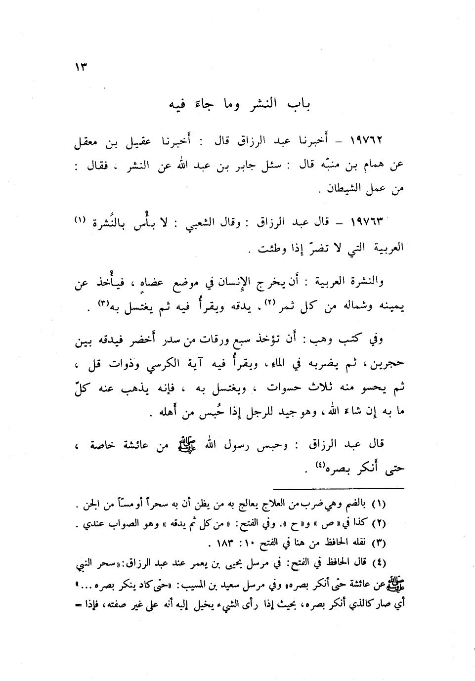 ١٩٧٦٣ - قَالَ عَبْدُ الرَّزَّاقِ: وَقَالَ الشَّعْبِيُّ: «لَا بَأْسَ بِالنُّشْرَةِ الْعَرَبِيَّةِ الَّتِي لَا تَضُرُّ إِذَا وُطِئَتْ» ، وَالنُّشْرَةُ الْعَرَبِيَّةُ: أَنْ يَخْرُجَ الْإِنْسَانُ فِي مَوْضِعِ عِضَاهٍ، فَيَأْخُذَ عَنْ يَمِينِهِ وَشِمَالِهِ مِنْ كُلِّ ثَمَرٍ يَدُقُّهُ وَيَقْرَأُ فِيهِ، ثُمَّ يَغْتَسِلُ بِهِ