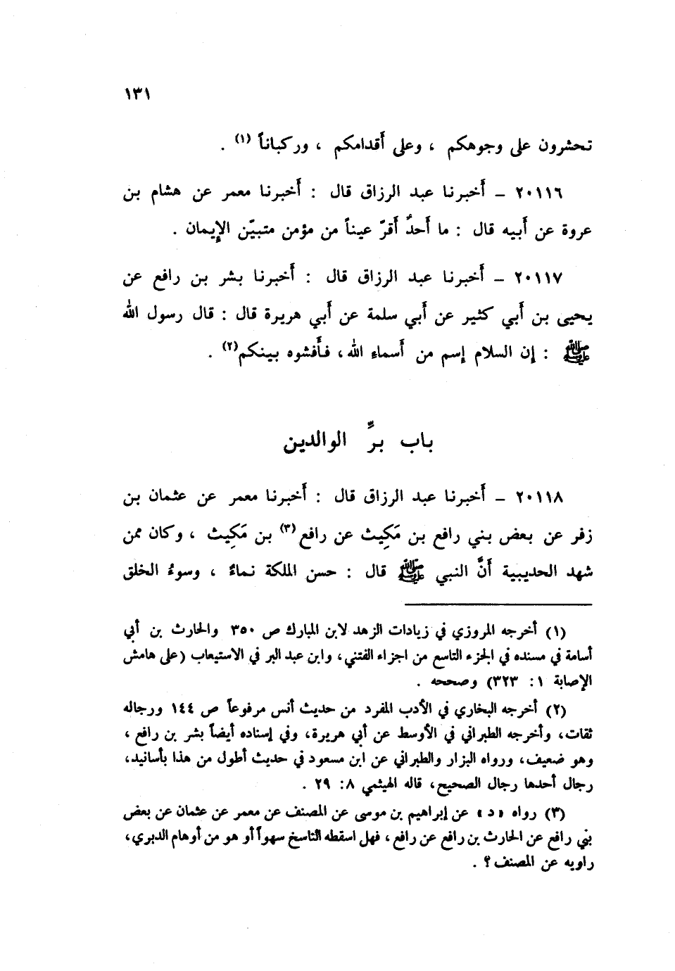 ٢٠١١٨ - أَخْبَرَنَا عَبْدُ الرَّزَّاقِ، قَالَ: أَخْبَرَنَا مَعْمَرٌ، عَنْ عُثْمَانَ بْنِ زُفَرَ، عَنْ بَعْضِ بَنِي رَافِعِ بْنِ مَكِيثٍ، عَنْ رَافِعِ بْنِ مَكِيثٍ - وَكَانَ مِمَّنْ شَهِدَ الْحُدَيْبِيَةَ - أَنَّ النَّبِيَّ صَلَّى اللهُ عَلَيْهِ وَسَلَّمَ قَالَ: «حُسْنُ الْمَلَكَةِ نَمَاءٌ، وَسُوءُ الْخُلُقِ شُؤْمٌ، وَالْبِرُّ زِيَادَةٌ فِي الْعُمْرِ، وَالصَّدَقَةُ تَمْنَعُ مِيتَةَ السُّوءِ»