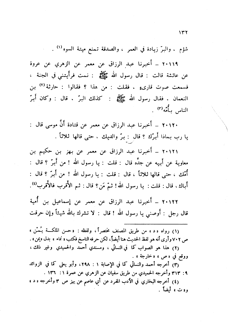 ٢٠١١٩ - أَخْبَرَنَا عَبْدُ الرَّزَّاقِ، عَنْ مَعْمَرٍ، عَنِ الزُّهْرِيِّ، عَنْ عُرْوَةَ، عَنْ عَائِشَةَ، قَالَتْ: قَالَ رَسُولُ اللَّهِ صَلَّى اللهُ عَلَيْهِ وَسَلَّمَ: «نِمْتُ فَرَأَيْتُنِي فِي الْجَنَّةِ، فَسَمِعْتُ صَوْتَ قَارِئٍ فَقُلْتُ: مَنْ هَذَا؟ فَقَالُوا: حَارِثَةُ بْنُ النُّعْمَانِ، فَقَالَ رَسُولُ اللَّهِ صَلَّى اللهُ عَلَيْهِ وَسَلَّمَ: كَذَلِكَ الْبِرُّ، قَالَ: وَكَانَ أَبَرَّ النَّاسِ بِأُمِّهِ»