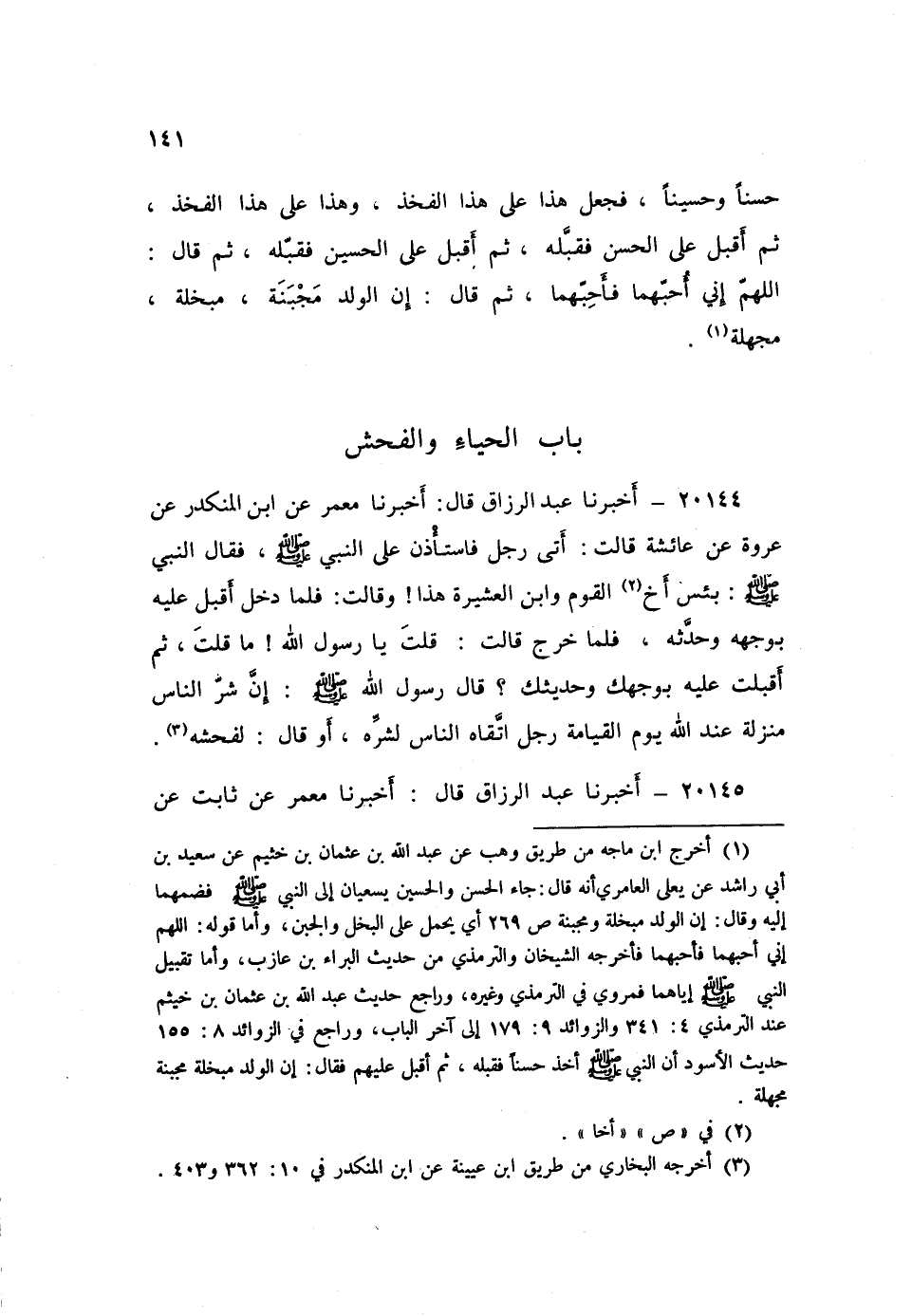 ٢٠١٤٤ - أَخْبَرَنَا عَبْدُ الرَّزَّاقِ، قَالَ: أَخْبَرَنَا مَعْمَرٌ، عَنِ ابْنِ الْمُنْكَدِرِ، عَنْ عُرْوَةَ، عَنْ عَائِشَةَ، قَالَتْ: أَتَى رَجُلٌ فَاسْتَأْذَنَ عَلَى النَّبِيِّ صَلَّى اللهُ عَلَيْهِ وَسَلَّمَ، فَقَالَ النَّبِيُّ صَلَّى اللهُ عَلَيْهِ وَسَلَّمَ: «بِئْسَ أَخُو الْقَوْمِ، وَابْنُ الْعَشِيرَةِ هَذَا» وَقَالَتْ: فَلَمَّا دَخَلَ أَقْبَلَ عَلَيْهِ بِوَجْهِهِ وَحَدَّثَهُ، فَلَمَّا خَرَجَ قَالَتْ: قُلْتَ يَا رَسُولَ اللَّهِ مَا قُلْتَ ثُمَّ أَقْبَلْتَ عَلَيْهِ بِوَجْهِكَ وَحَدِيثِكَ، قَالَ رَسُولُ اللَّهِ صَلَّى اللهُ عَلَيْهِ وَسَلَّمَ: «إِنَّ شَرَّ النَّاسِ مَنْزِلَةً عِنْدَ اللَّهِ يَوْمَ الْقِيَامَةِ رَجُلٌ اتَّقَاهُ النَّاسُ لِشَرِّهِ - أَوْ قَالَ: لِفُحْشِهِ»