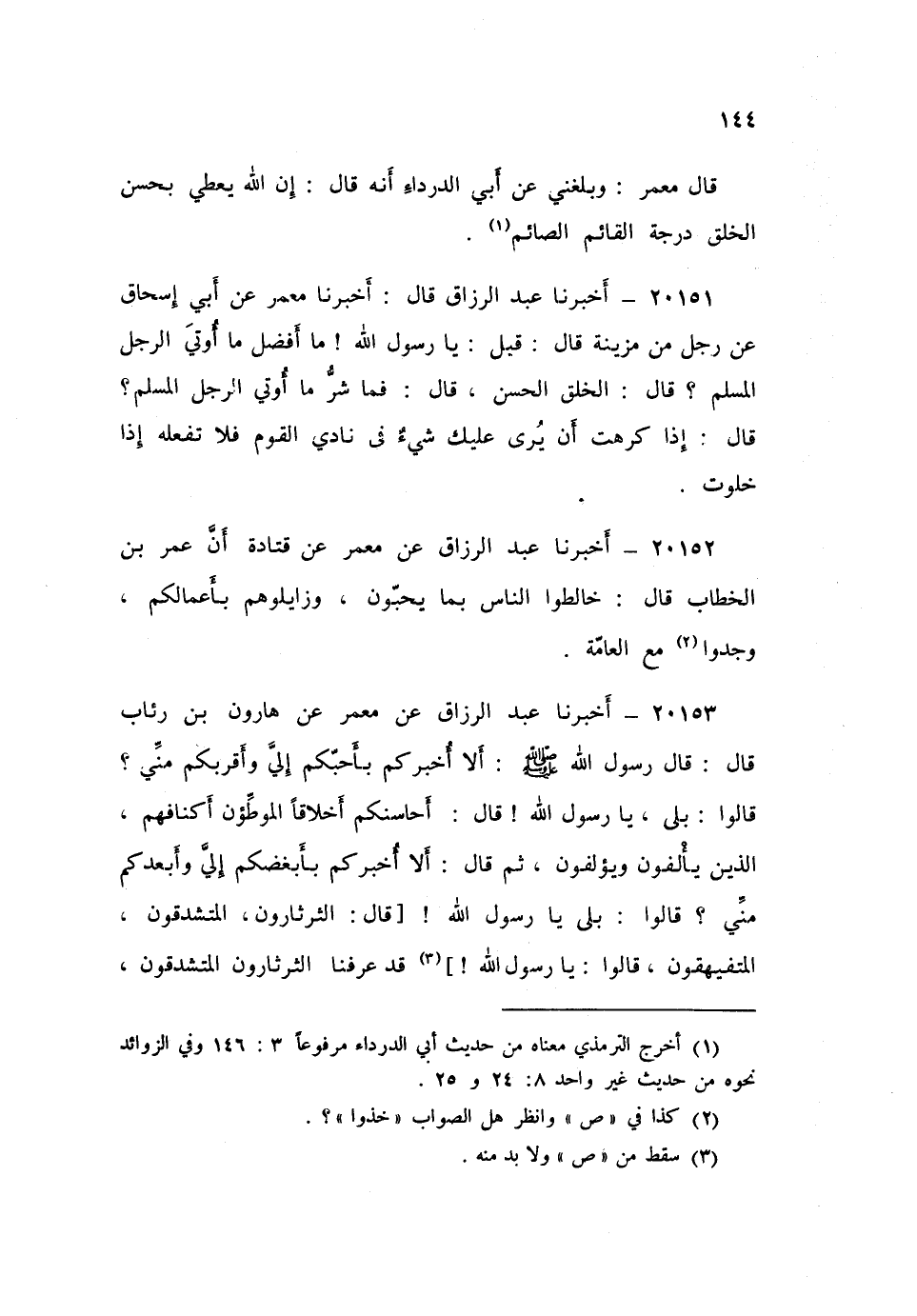 ٢٠١٥٣ - أَخْبَرَنَا عَبْدُ الرَّزَّاقِ، عَنْ مَعْمَرٍ، عَنْ هَارُونَ بْنِ رِئَابٍ، قَالَ: قَالَ رَسُولُ اللَّهِ صَلَّى اللهُ عَلَيْهِ وَسَلَّمَ: «أَلَا أُخْبِرُكُمْ بِأَحَبِّكُمْ إِلَيَّ وَأَقْرَبِكُمْ مِنِّي؟» ، قَالُوا: بَلَى يَا رَسُولَ اللَّهِ، قَالَ: «أَحَاسِنُكُمْ أَخْلَاقًا الْمُوَطَّئُونَ أكْنَافُهُمْ، الَّذِينَ يَأْلَفُونَ وَيُؤْلَفُونَ» ثُمَّ قَالَ: «أَلَا أُخْبِرُكُمْ بأبْغَضِكُمْ إِلَيَّ وَأبعدِكُمْ مِنِّي؟» ، قَالُوا: بَلَى يَا رَسُولَ اللَّهِ، قَالَ: «الثَّرْثَارُونَ الْمُتَشَدِّقُونَ الْمُتَفَيْهِقُونَ» قَالُوا: يَا رَسُولَ اللَّهِ، قَدْ عَرَفْنَا الثَّرْثَارُونَ الْمُتَشَدِّقُونَ، فَمَا الْمُتَفَيْهِقُونَ؟ قَالَ: «الْمُتَكَبِّرُونَ»