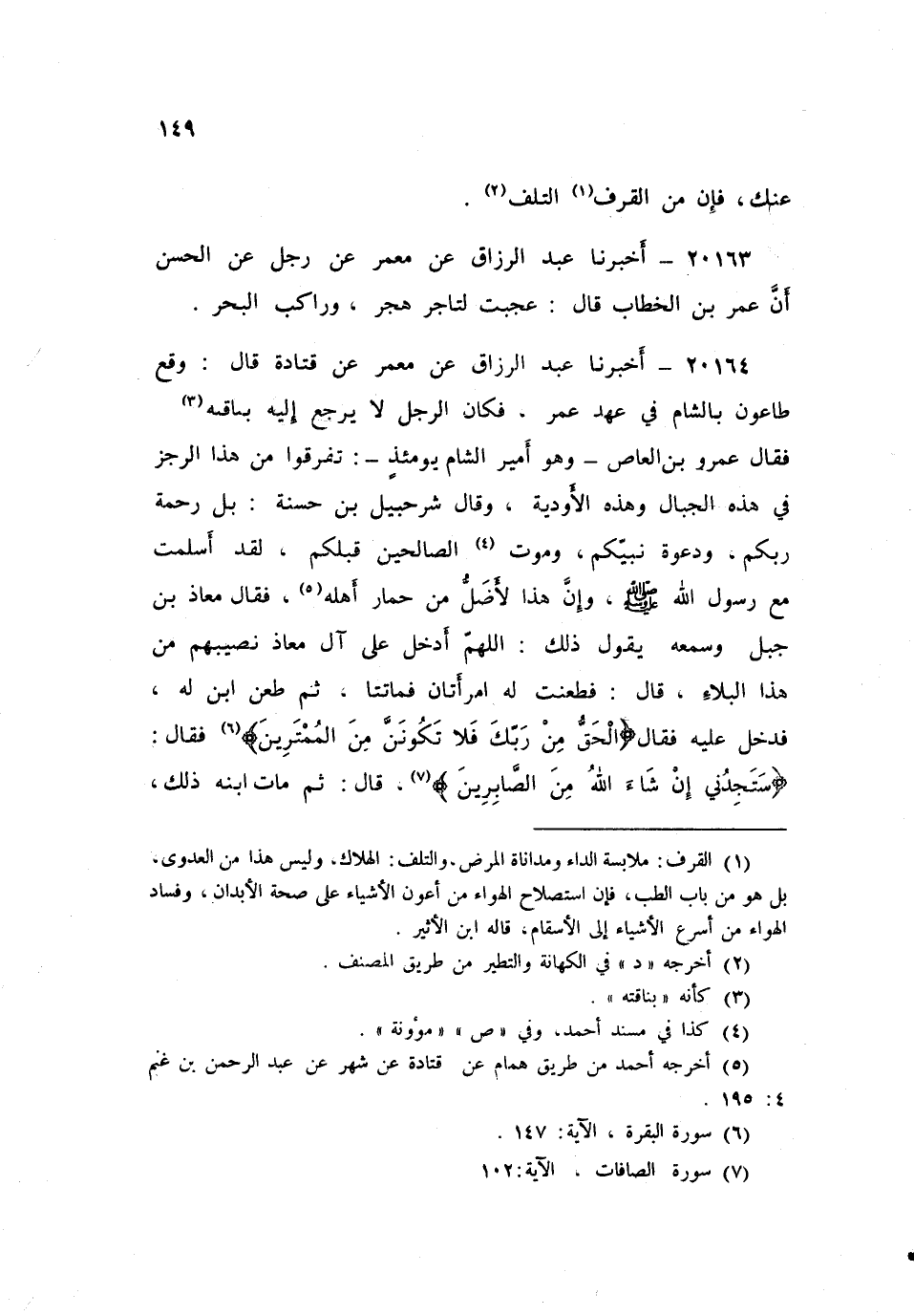 ٢٠١٦٤ - أَخْبَرَنَا عَبْدُ الرَّزَّاقِ، عَنْ مَعْمَرٍ، عَنْ قَتَادَةَ، قَالَ: وَقَعَ طَاعُونٌ بِالشَّامِ فِي عَهْدِ عُمَرَ، فَكَانَ الرَّجُلُ لَا يَرْجِعُ إِلَيْهِ بِنَاقَتِهِ، فَقَالَ عَمْرُو بْنُ الْعَاصِ - وَهُوَ أَمِيرُ الشَّامِ يَوْمَئِذٍ -: تَفَرَّقُوا مِنْ هَذَا الرِّجْزِ فِي هَذِهِ الْجِبَالِ وَهَذِهِ الْأَوْدِيَةِ، وَقَالَ شُرَحْبِيلُ ابْنُ حَسَنَةَ: «بَلْ رَحْمَةُ رَبِّكُمْ، وَدَعْوَةُ نَبِيِّكُمْ، وَمَوْتُ الصَّالِحِينَ قَبْلَكُمْ» ، لَقَدْ أَسْلَمْتُ مَعَ رَسُولِ اللَّهِ صَلَّى اللهُ عَلَيْهِ وَسَلَّمَ، وَإِنَّ هَذَا لَأَضَلُّ مِنْ حِمَارِ أَهْلِهِ، فَقَالَ مُعَاذُ بْنُ جَبَلٍ وَسَمِعَهُ يَقُولُ ذَلِكَ: اللَّهُمَّ أَدْخِلْ عَلَى آلِ مُعَاذٍ نَصِيبَهُمْ مِنْ هَذَا الْبَلَاءِ، قَالَ: فَطُعِنَتْ لَهُ امْرَأَتَانِ فَمَاتَتَا، ثُمَّ طُعِنَ ابْنٌ لَهُ فَدَخَلَ عَلَيْهِ، فَقَالَ: {الْحَقُّ مِنْ رَبِّكَ فَلَا تَكُونَنَّ مِنَ الْمُمْتَرِينَ} [البقرة: ١٤٧] ، فَقَالَ: {سَتَجِدُنِي إِنْ شَاءَ اللَّهُ مِنَ الصَّابِرِينَ} [الصافات: ١٠٢] ، قَالَ: ثُمَّ مَاتَ ابْنُهُ ذَلِكَ، ⦗١٥٠⦘ فَدَفَنَهُ ثُمَّ طُعِنَ مُعَاذٌ فَجَعَلَ يُغْشَى عَلَيْهِ فَإِذَا أَفَاقَ قَالَ: رَبِّ غُمَّنِي غَمَّكَ، فَوَعِزَّتِكَ إِنَّكَ لَتَعْلَمُ أَنِّي أُحِبُّكَ، قَالَ: ثُمَّ يُغْشَى عَلَيْهِ، فَإِذَا أَفَاقَ قَالَ مِثْلَ ذَلِكَ، قَالَ: فَأَفَاقَ فَإِذَا هُوَ بِرَجُلٍ يَبْكِي عِنْدَهُ، قَالَ: مَا يُبْكِيكَ؟ فَقَالَ: أَمَا وَاللَّهِ مَا أَبْكِي عَلَى دُنْيَا أطْمَعُ أَنْ أُصِيبَهَا مِنْكَ، وَلَكِنِّي أَبْكِي عَلَى الْعِلْمِ الَّذِي أُصِيبُ مِنْكَ، قَالَ: فَلَا تَبْكِ، فَإِنَّ الْعِلْمَ لَا يَذْهَبُ وَالْتَمِسْهُ مِنْ حَيْثُ التَّمَسَهُ خَلِيلُ اللَّهِ إِبْرَاهِيمُ، فَإِذَا أَنَا مِتُّ فَالْتَمِسِ الْعِلْمَ عِنْدَ أَرْبَعَةِ نَفَرٍ: عَبْدِ اللَّهِ بْنِ سَلَامٍ، وَعَبْدِ اللَّهِ بْنِ مَسْعُودٍ، وَسَلْمَانَ، وَعُوَيْمِرٍ أَبِي الدَّرْدَاءِ، فَإِنْ أعْيَوْكَ فَالنَّاسُ أَعْيَى، قَالَ: ثُمَّ مَاتَ