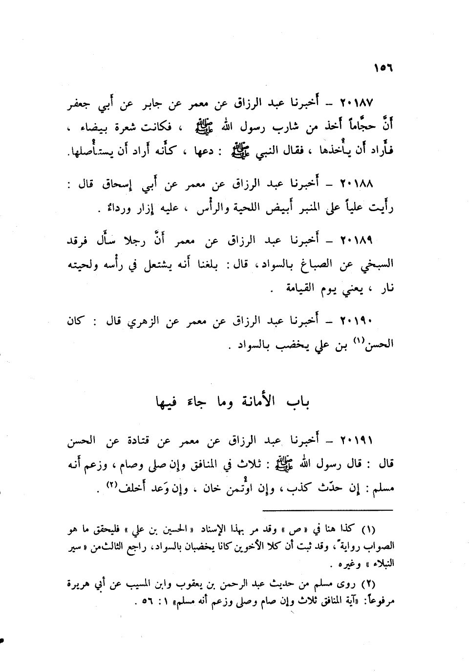 ٢٠١٩٠ - أَخْبَرَنَا عَبْدُ الرَّزَّاقِ، عَنْ مَعْمَرٍ، عَنِ الزُّهْرِيِّ، قَالَ: «كَانَ الْحَسَنُ بْنُ عَلِيٍّ يَخْضِبُ بِالسَّوَادِ»