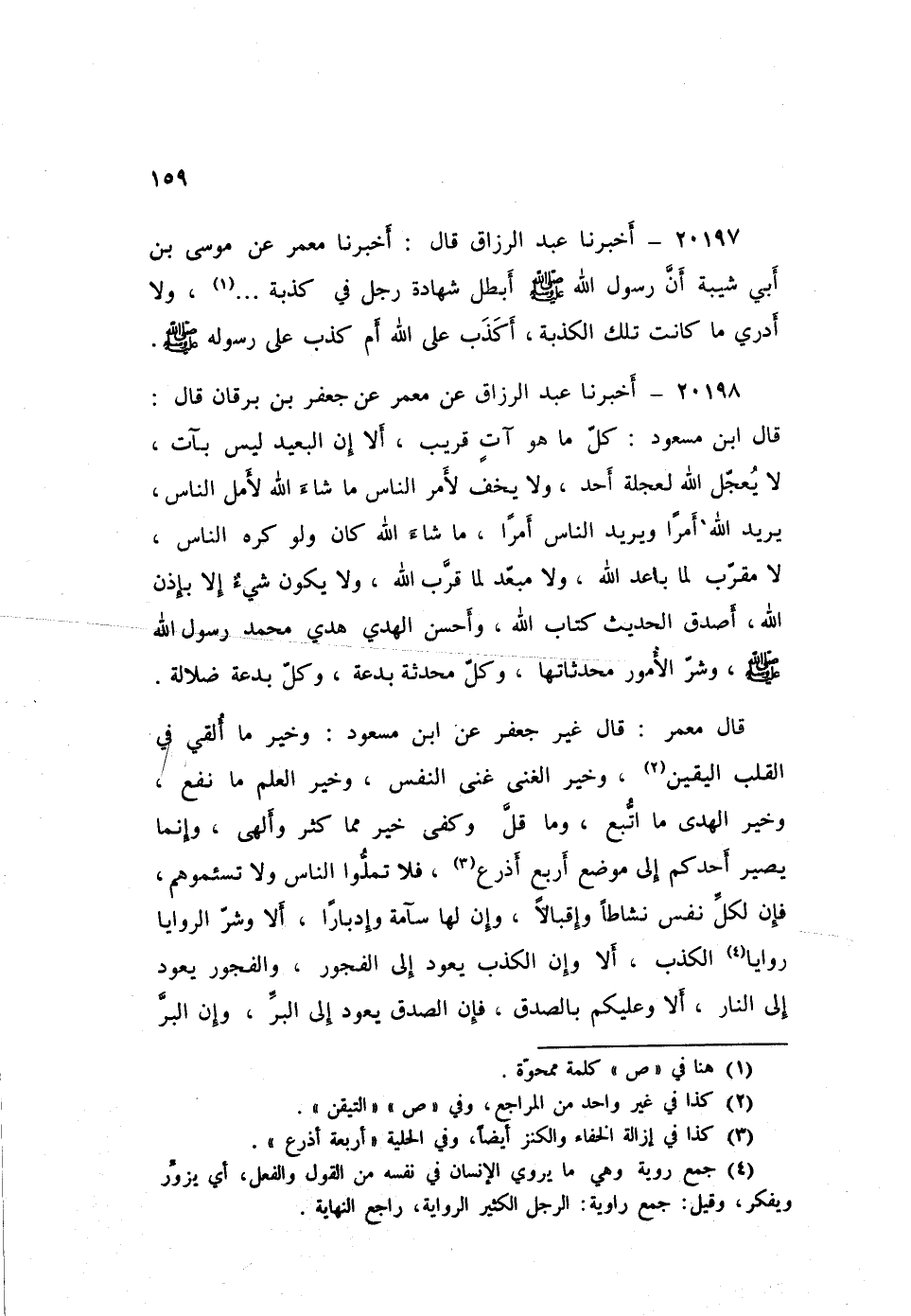 قَالَ مَعْمَرٌ: قَالَ غَيْرُ جَعْفَرٍ: عَنِ ابْنِ مَسْعُودٍ: «وَخَيْرُ مَا أُلْقِيَ فِي الْقَلْبِ الْيَقِينُ، وَخَيْرُ الْغِنَى غِنَى النَّفْسِ، وَخَيْرُ الْعِلْمِ مَا نَفَعَ، وَخَيْرُ الْهُدَى مَا اتُّبِعَ، وَمَا قَلَّ وَكَفَى خَيْرٌ مِمَّا كَثُرَ وَأَلْهَى، وَإِنَّمَا يَصِيرُ أَحَدُكُمْ إِلَى مَوْضِعِ أَرْبَعِ أَذْرُعٍ فَلَا تُمِلُّوا النَّاسَ وَلَا تُسْئِمُوهُمْ، فَإِنَّ لِكُلِّ نَفْسٍ نَشَاطًا وَإِقْبَالًا، وَإِنَّ لَهَا سَآمَةً وَإِدْبَارًا، أَلَا وَشَرُّ الرَّوَايَا رَوَايَا الْكَذِبِ، أَلَا وَإِنَّ الْكَذِبَ يَعُودُ إِلَى الْفُجُورِ، وَالْفُجُورَ يَعُودُ إِلَى النَّارِ، أَلَا وَعَلَيْكُمْ بِالصِّدْقِ، فَإِنَّ الصِّدْقَ يَعُودُ إِلَى الْبِرِّ، وَإِنَّ الْبِرَّ ⦗١٦٠⦘ يَعُودُ إِلَى الْجَنَّةِ، وَاعْتَبِرُوا فِي ذَلِكَ أَنَّهُمَا إِلْفَانِ، يُقَالُ لِلصَّادِقِ: يَصْدُقُ حَتَّى يُكْتَبَ صِدِّيقًا، وَلَا يَزَالُ يَكْذِبُ حَتَّى يُكْتَبَ كَاذِبًا، أَلَا وَإِنَّ الْكَذِبَ لَا يَحِلُّ فِي جِدٍّ وَلَا هَزْلٍ، وَلَا أَنْ يَعِدَ الرَّجُلُ مِنْكُمْ صَبِيَّهُ ثُمَّ لَا يُنْجِزَ لَهُ، أَلَا وَلَا تَسْأَلُوا أَهْلَ الْكِتَابِ عَنْ شَيْءٍ فَإِنَّهُمْ قَدْ طَالَ عَلَيْهِمُ الْأَمَدُ فَقَسَتْ قُلُوبُهُمْ، وَابْتَدَعُوا فِي دِينِهِمْ، فَإِنْ كُنْتُمْ لَا مَحَالَةَ بِسَائِلِيهِمْ فَمَا وَافَقَ كِتَابَكُمْ فَخُذُوهُ، وَمَا خَالَفَهُ فَاهْدُوا عَنْهُ وَاسْكُتوا، أَلَا وَإِنَّ أَصْغَرَ الْبُيُوتِ الْبَيْتُ الَّذِي لَيْسَ فِيهِ مِنْ كِتَابِ اللَّهِ شَيْءٌ، خَرِبٌ كَخِرَبِ الْبَيْتِ الَّذِي لَا عَامِرَ لَهُ، أَلَا وَإِنَّ الشَّيْطَانَ يَخْرُجُ مِنَ الْبَيْتِ الَّذِي يَسْمَعُ فِيهِ سُورَةَ الْبَقَرَةِ تُقْرَأُ فِيهِ»