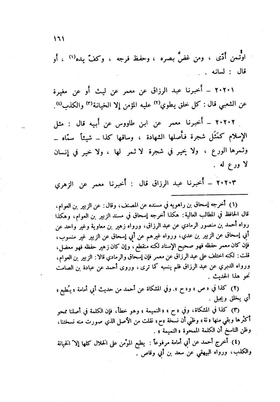 ٢٠٢٠١ - أَخْبَرَنَا عَبْدُ الرَّزَّاقِ، عَنْ مَعْمَرٍ، عَنْ لَيْثٍ، أَوْ: عَنْ مُغِيرَةَ، عَنِ الشَّعْبِيِّ، قَالَ: «كُلُّ خُلُقٍ يَطْوِي عَلَيْهِ الْمُؤْمِنُ إِلَّا الْخِيَانَةَ وَالْكَذِبَ»